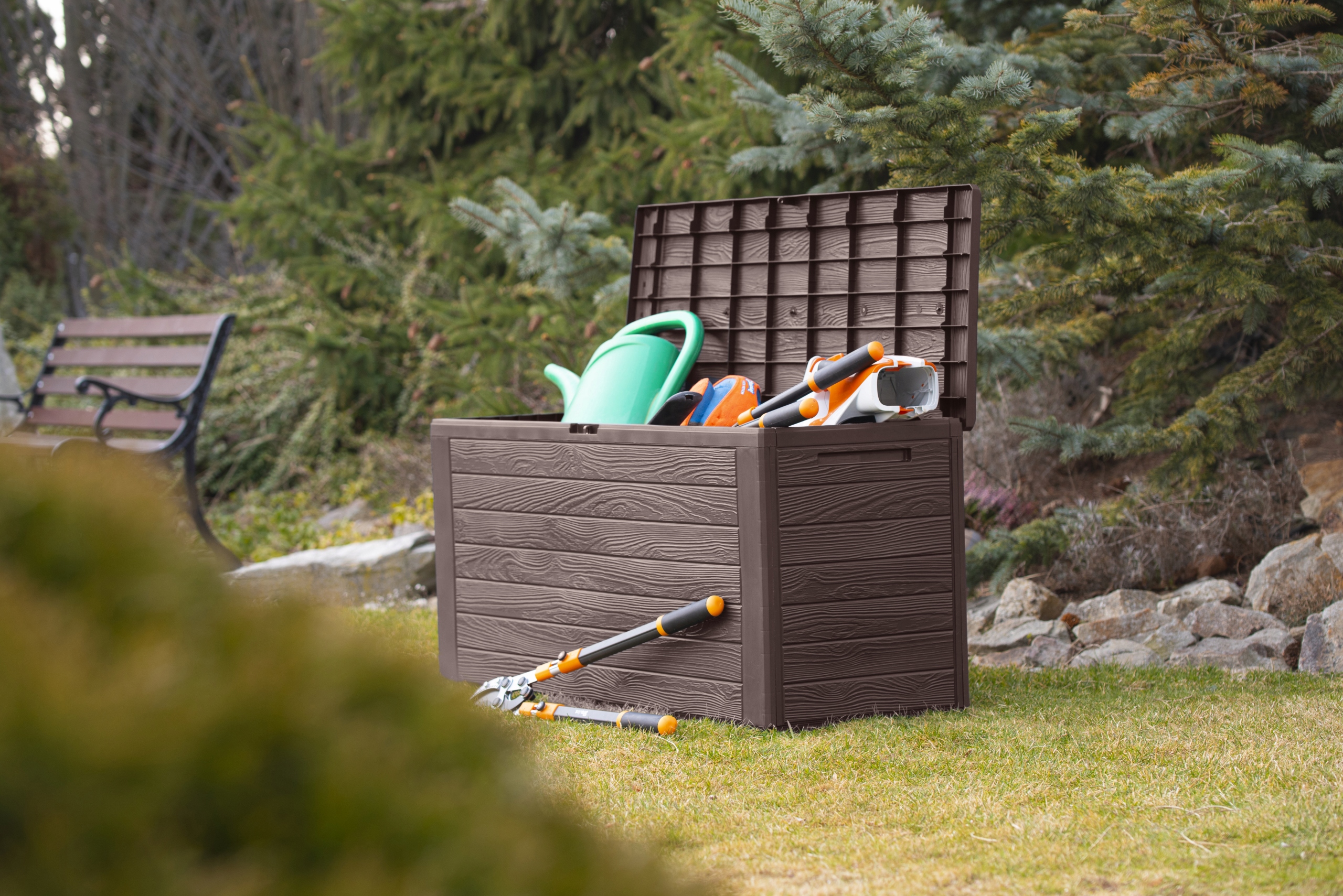 Ящик предназначен для хранения различных инструментов и садовых принадлежностей, подушек и детских игрушек. Современный стиль и классические цвета позволяют ящику вписаться в любой садовый декор.