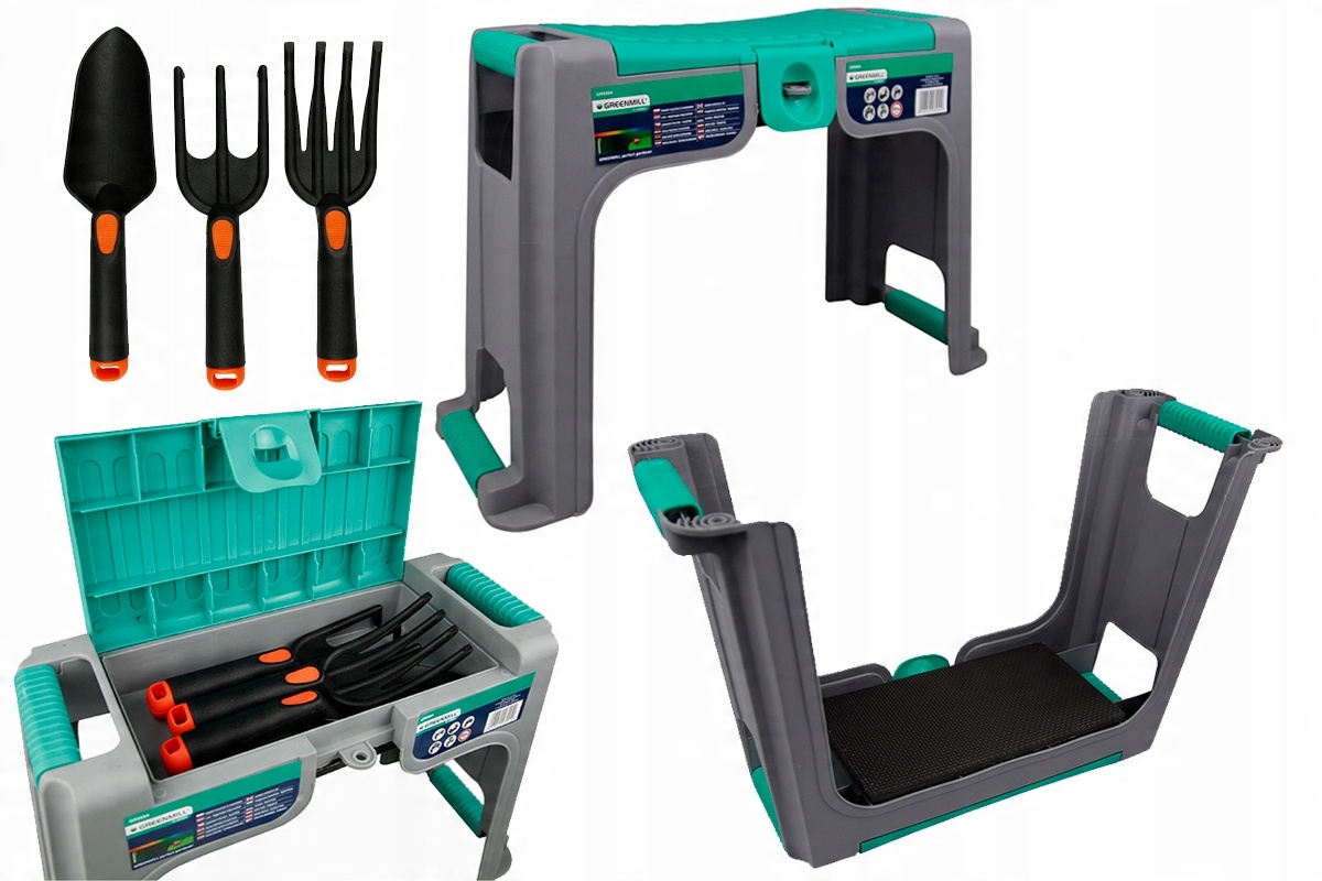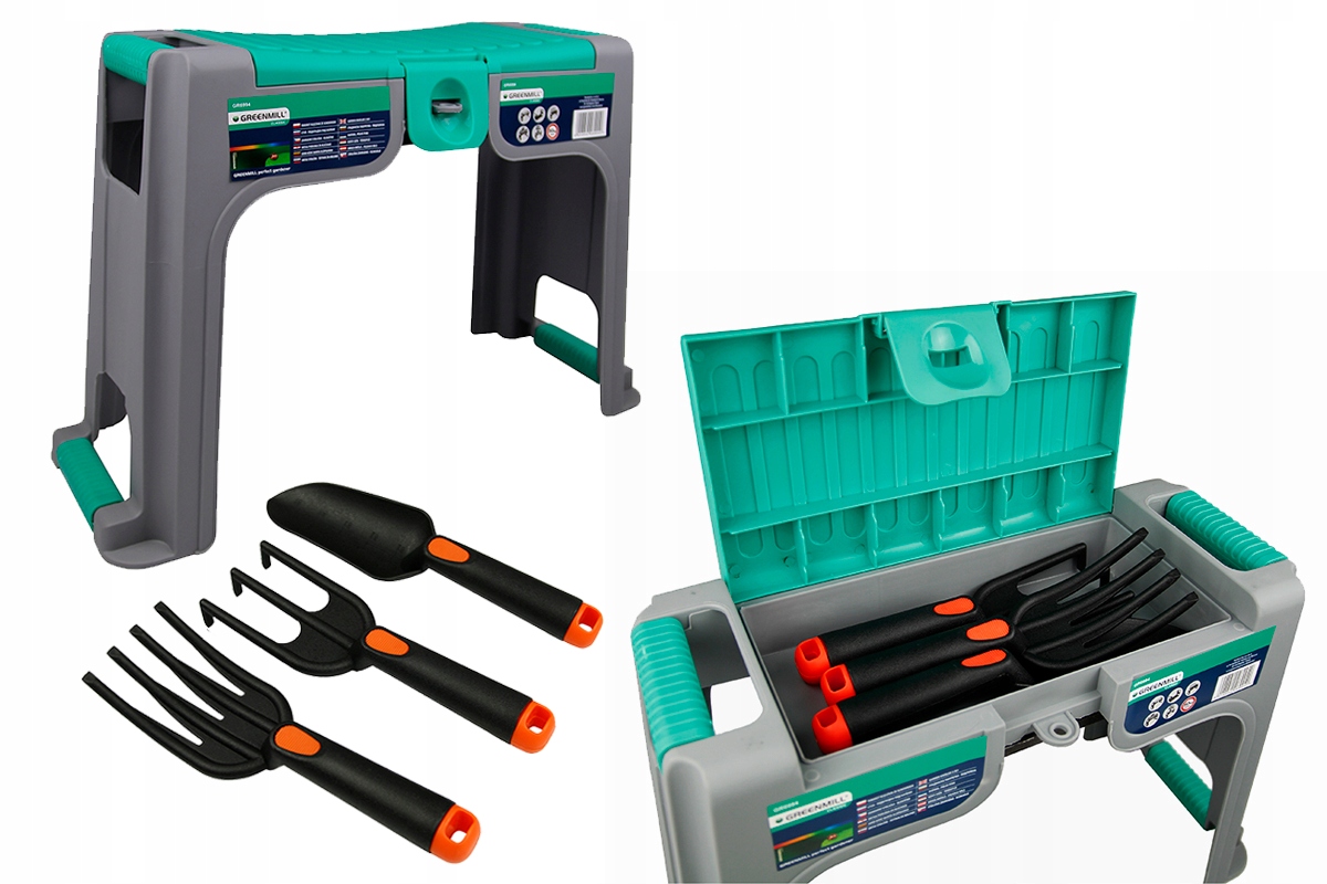 Табурет, садовый коленвал + набор из 3 инструментов: лопатка, вилки и когти