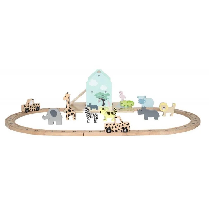 Гоночная трасса включает в себя два джипа, лестницу, домик с практичной ручкой, чтобы его можно было легко взять с собой куда угодно, двенадцать деревянных элементов трассы (совместимых с другими брендами) и девять диких животных: лев , зебра, жираф, крокодил, фламинго, бегемот, тигр, слон и обезьяна.