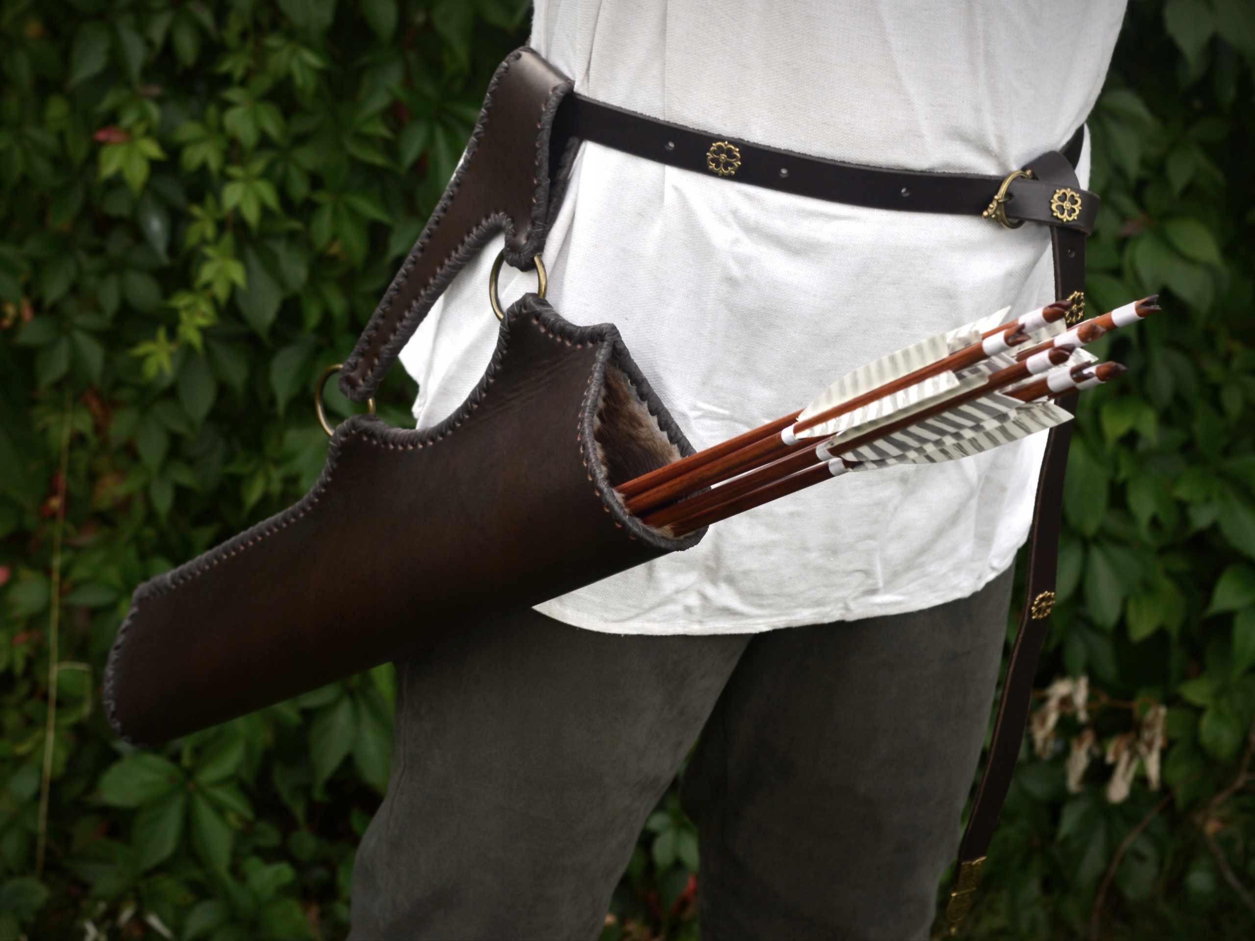 Поясной колчан выполнен полностью из натуральной кожи, состоящий из двух элементов, соединенных латунными кольцами: колчана и поясного крепления.
