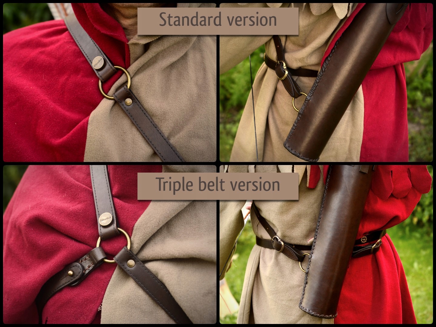 Колчан также доступен в версии с тремя ремнями. Дополнительный ремень крепится к другой стороне колчана и крепится к груди. Такое крепление значительно повышает устойчивость колчана и предотвращает его перемещение по спине. Решение особенно рекомендуется лучникам, которые стреляют на ходу и много передвигаются.