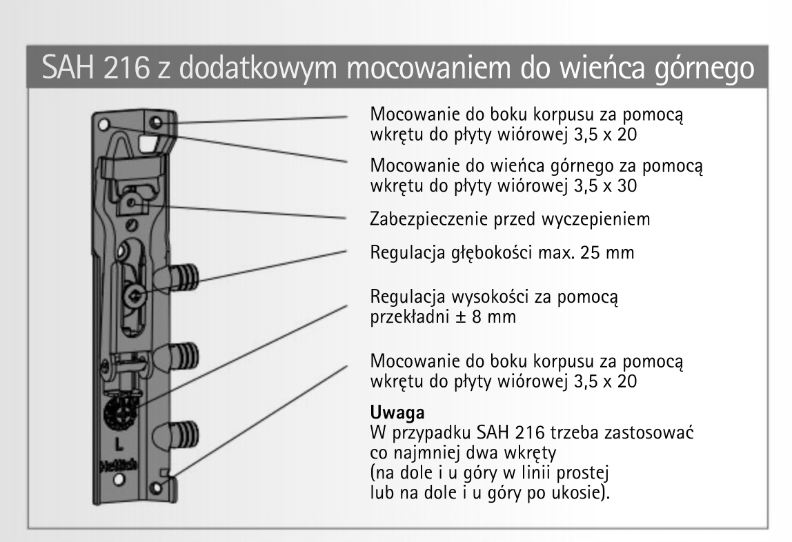 Просматривая «SAH 216 - Подвеска кабинета (P+L) твердый, 55 кг, Hettich», вы можете быть уверены, что данный товар из каталога «[rubrica_name]» будет доставлен из Польши и проверен на целостность. В цене товара, указанной на сайте, учтена доставка из Польши. Внимание!!! Товары для Евросоюза, согласно законодательству стран Евросоюза, могут отличаться упаковкой или наполнением.