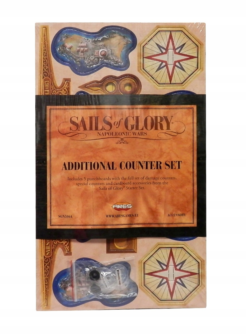 Это расширение содержит набор жетонов, аналогичный набору, включенному в стартовый набор Sails of Glory. Содержит сотни высококачественных картонных жетонов, а также пластиковые основы, необходимые для сборки двух указателей ориентации и указателя ветра.