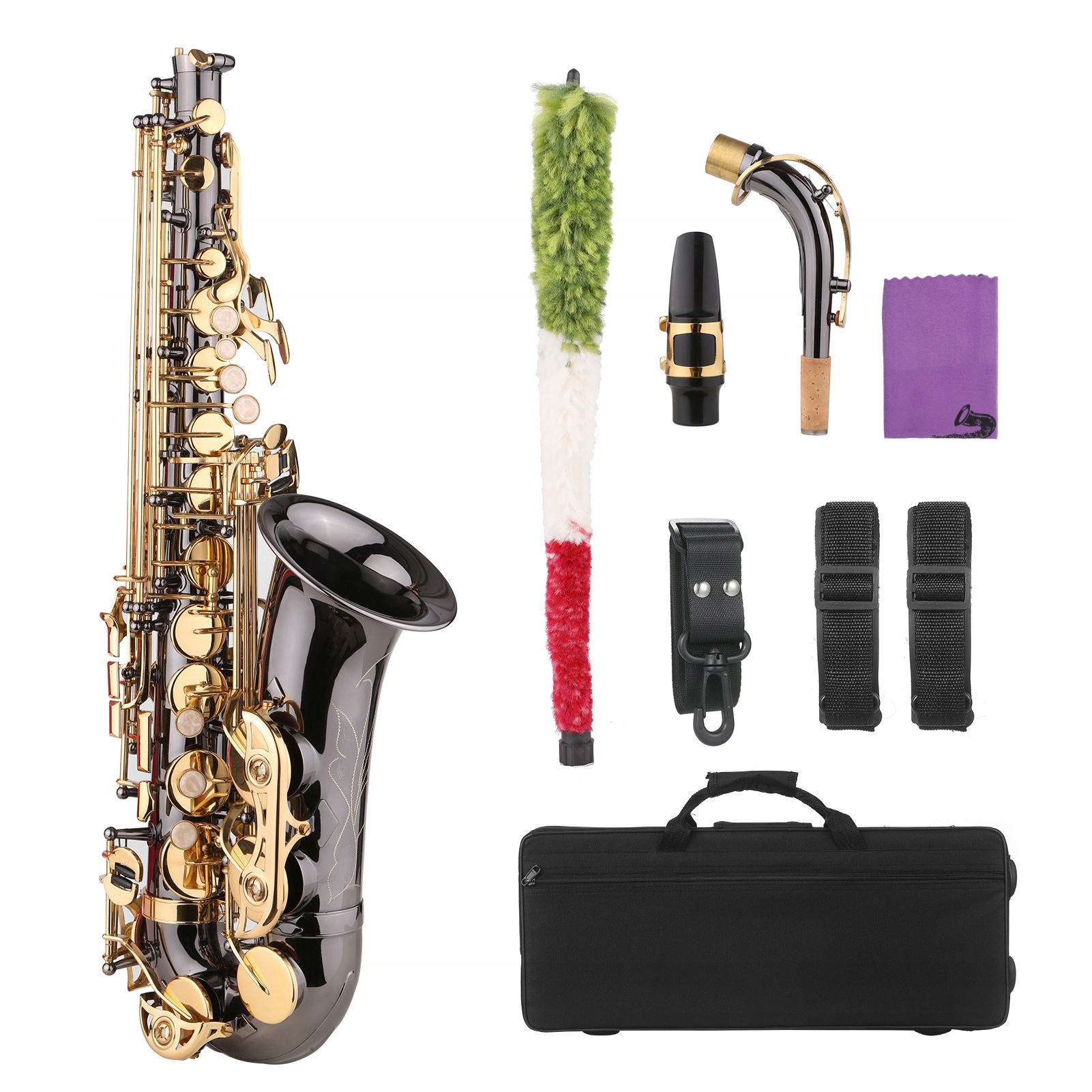 Все основные аксессуары включены - ткань и щетка для ежедневного обслуживания; Саксофонный ремень для производительности; и вопрос, который должен быть передан для защиты и хранения устройства, а также для портативности.