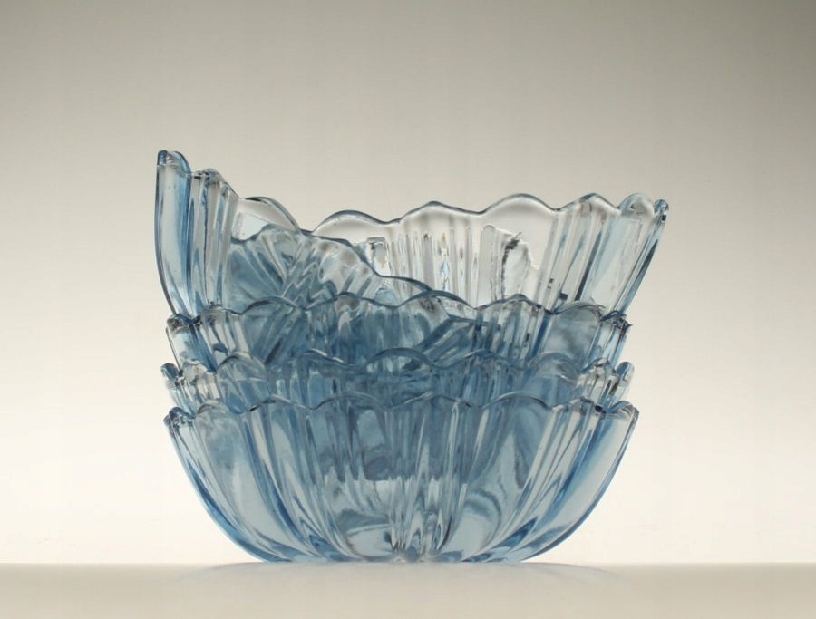 Салатовники (1 большая и 5 маленьких) из синего прессованного стекла. Они производятся на отечественном стекольном заводе «Зомбковице» в Домбровой Гурнице. Каталожный номер 1085. 1960-е/1970-е гг.