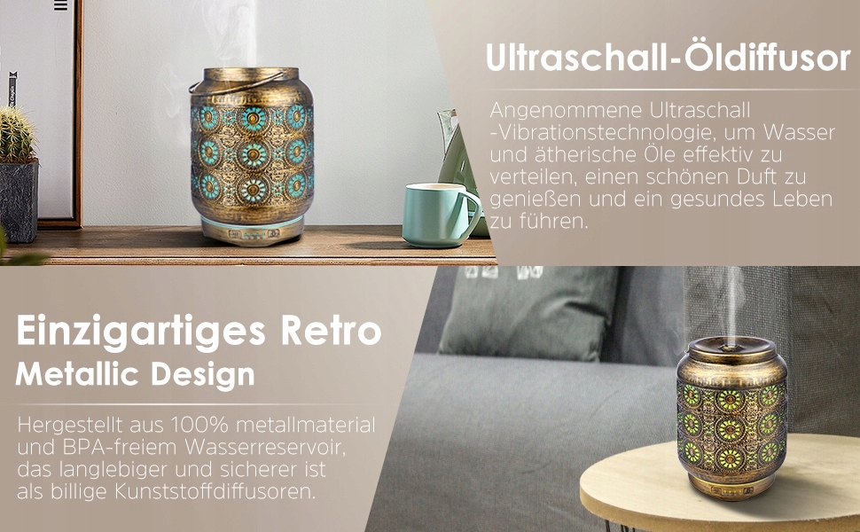 Металлический диффузор ароматов SALKING — уникальный фонарь Создайте свой собственный ароматный мир. В нашем ароматном диффузоре используется специальная ультразвуковая технология, позволяющая создать неповторимый аромат. нежный туман, который распространяется по воздуху в комнате. Работает только с водой, и вы можете добавить эфирные масла по вашему желанию. Благодаря ультразвуковой технологии ни масла, ни вода не нагреваются и не сгорают, а это означает, что важные и ценные ингредиенты эфирных масел полностью сохраняются.