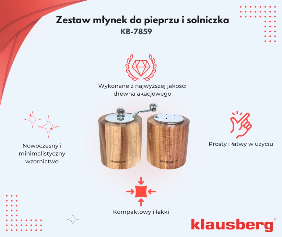 klauberg KB7859 Соль и перец набор и перец. Шполовный механизм керамического шлифования. Он имеет регулирование толщины шлифования.