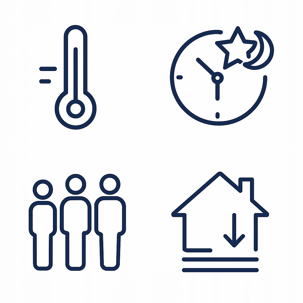 - Автоматическое снижение температуры в ночное время или во время отсутствия жильцов.