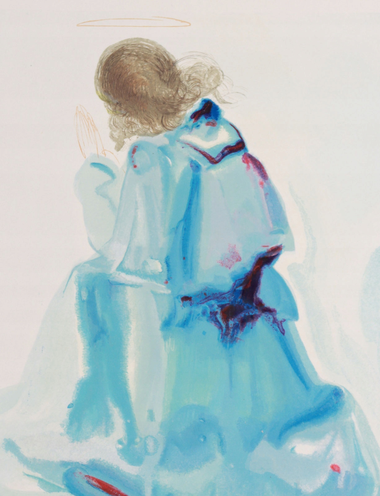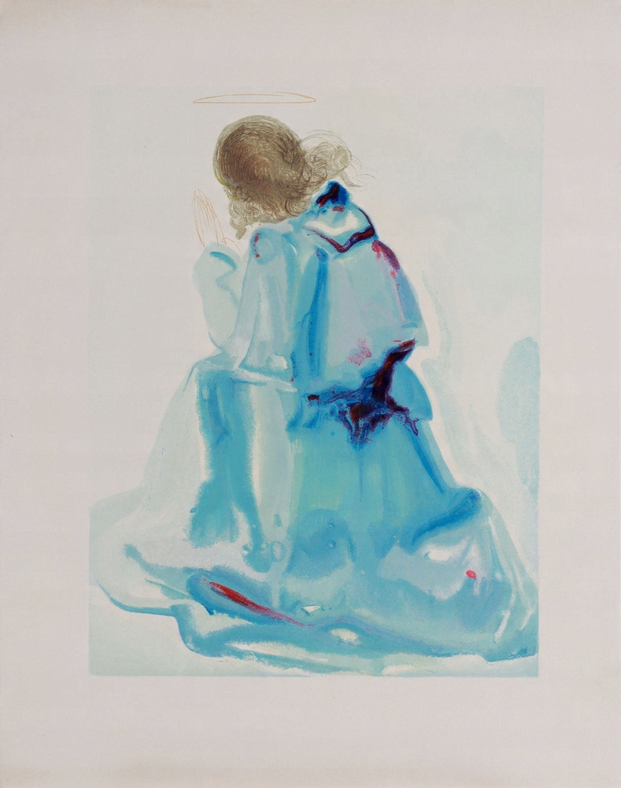 Сальвадор Дали выполнен в 1950-х годах по поручению библиотека Libreria dello Stato в Риме набор иллюстраций к юбилейному изданию «Божественной комедии» Данте Алигьери к 700-летию со дня рождения ее автора. Он нарисовал 100 акварельных иллюстраций, одну вступительную и по 33 по содержанию каждой части стихотворения: Ад, Чистилище и Рай. Получившиеся работы считаются одним из самых выдающихся достижений художника. Несмотря на выход из контракта итальянцев (которые в конечном итоге доверили исполнение заказа своему соотечественнику), Дали завершил монументальную работу. Акварели были представлены в Риме и Париже — права на них в 1959 году купила компания Les Heures Claires. Затем художник и два прекрасных мастера гравюры по дереву (Раймон Жаке и Жан Тарикко) перевели их в гравюры на дереве. Для адаптации их к цветной печати из самшита были изготовлены специальные ксилографические блоки в количестве 30–40 штук на каждую иллюстрацию. Наконец, они были опубликованы во Франции на эксклюзивной бумаге BFK – Rives.