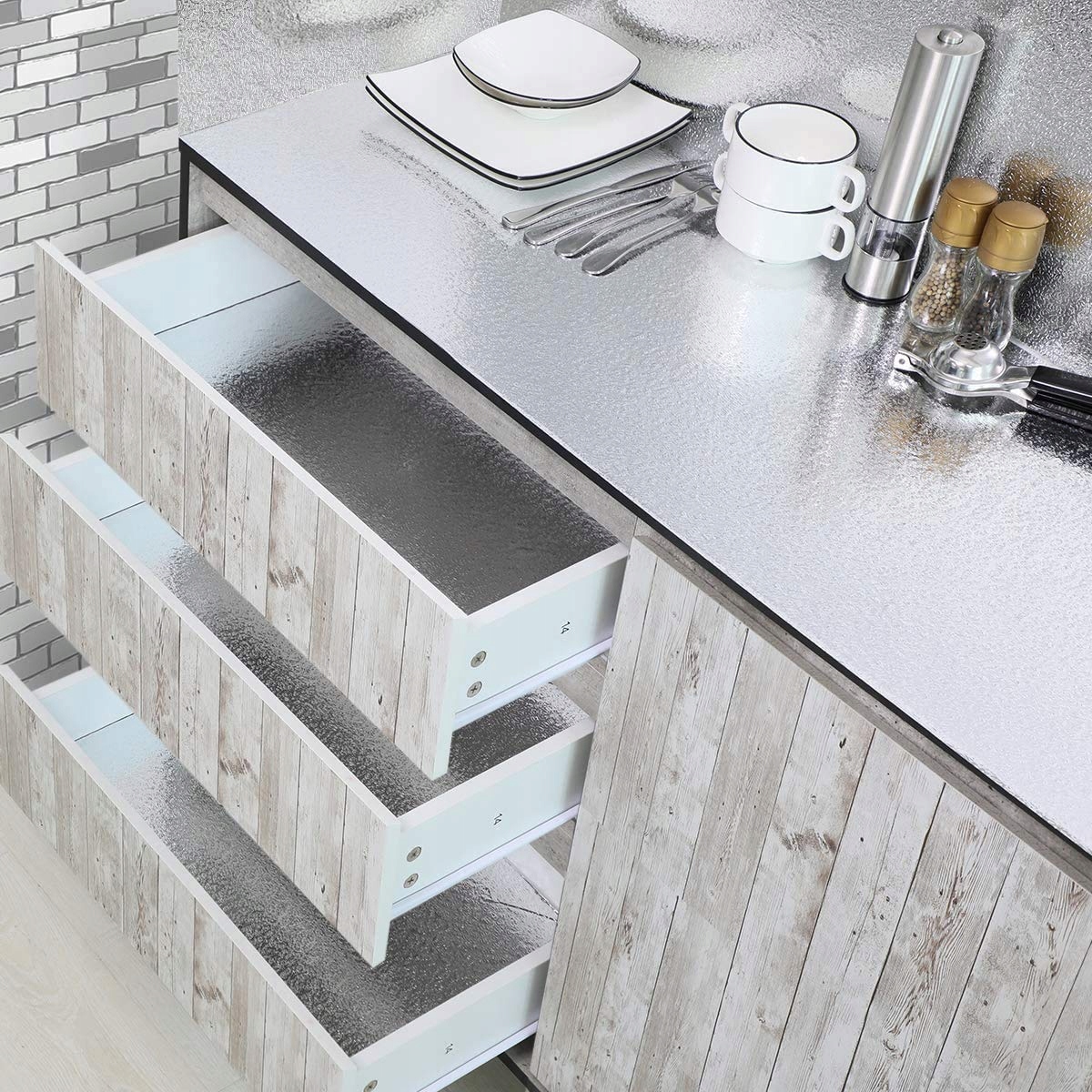 , устойчивое к жирной и влажной алюминиевой фольге, будет работать в качестве защитного коврика кухонного столешницы, а полки, плитки на стене и даже фронты шкафов. также может быть успешно использован в мастерской или в гараже. Это легко в самообвичении и разборке, и благодаря сильным слою клея он очень хорошо придерживается различных плоскостей. фольга может быть свободно разрезана, чтобы соответствовать ее поверхности, на которой она должна быть приклеена. Кроме того, его серебряная поверхность имеет интересную текстуру, , которая будет отлично работать в каждой комнате, независимо от его дизайна.
