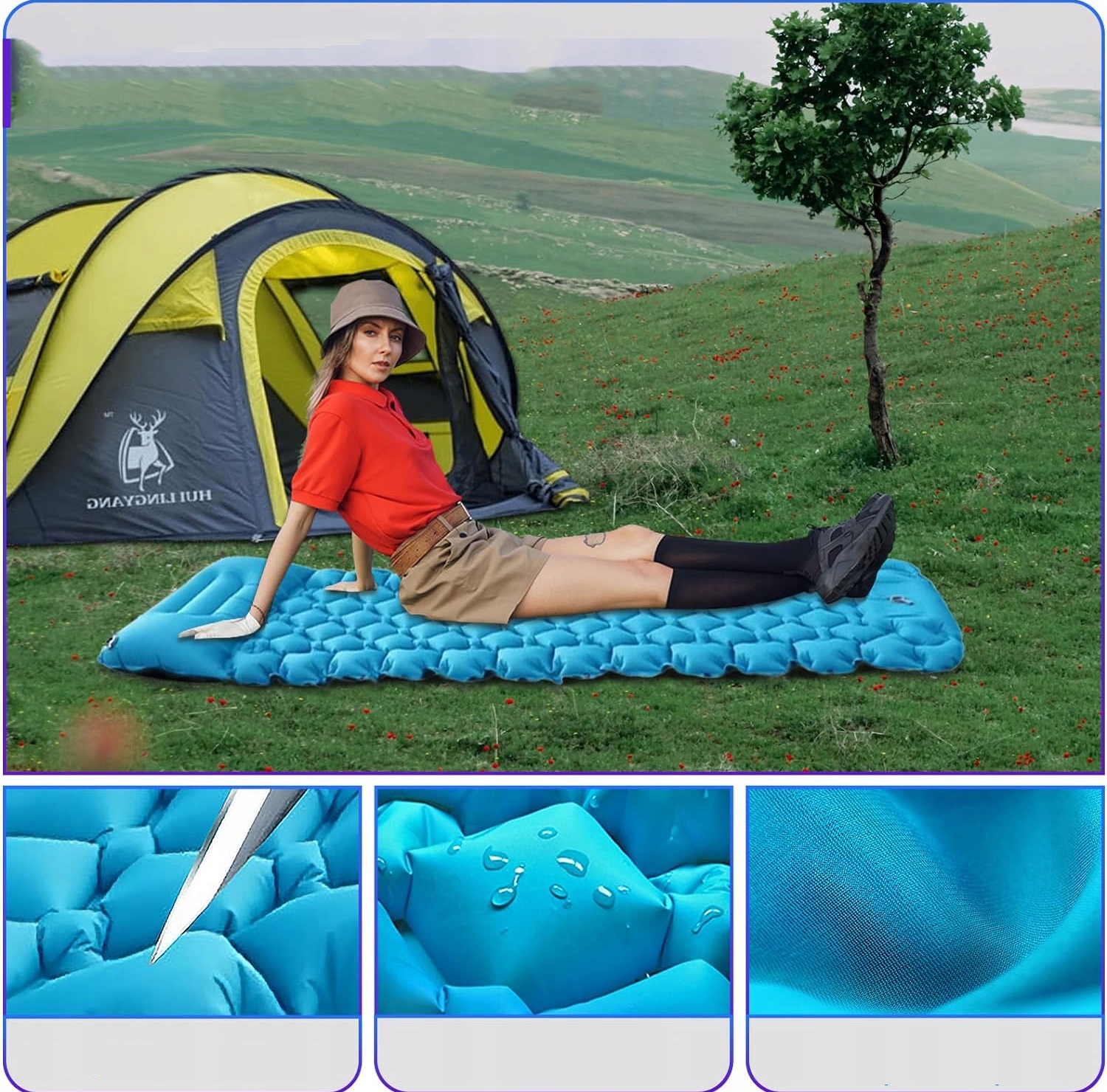 Складный спальный коврик оснащен ножным насосом, который позволяет полностью надувать большой спальный коврик в течение 1 минуты с помощью простого взбивания. Это более удобно, экономит и гигиена. Вам не нужно взорвать рот или сжать руку.