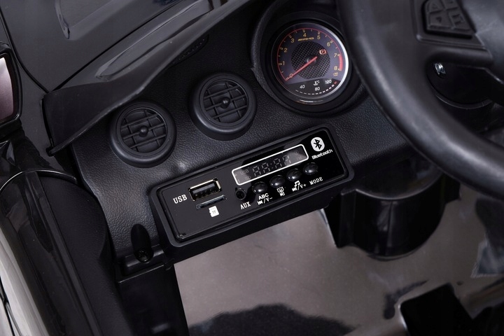 Автомобиль предназначен для использования на открытом воздухе. Транспортным средством можно управлять с помощью пульта дистанционного управления или ребенок может делать это самостоятельно с помощью педали газа, руля и коробки передач. Сидя в автомобиле, вы также можете управлять музыкой с рабочего стола и рулевого колеса.
