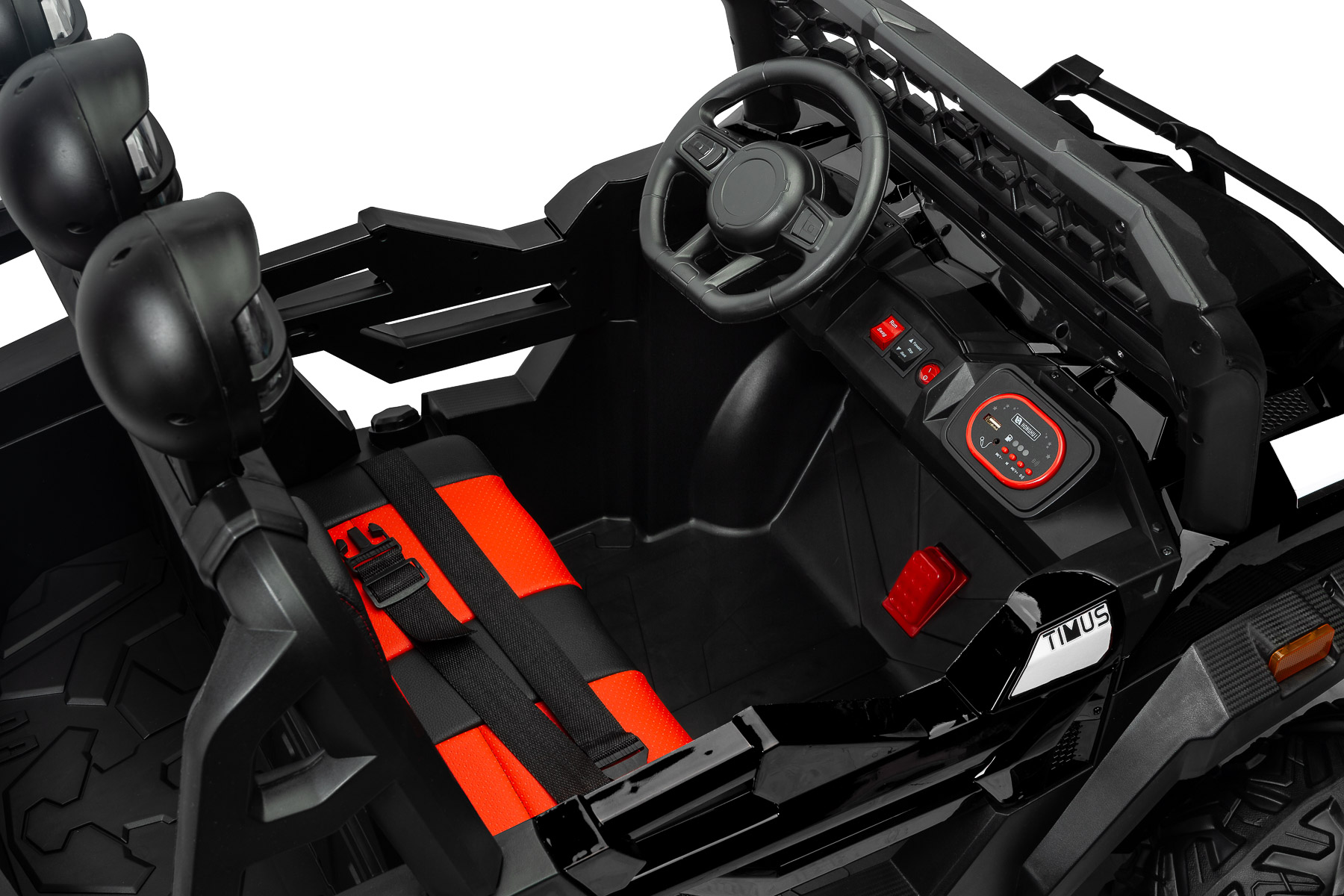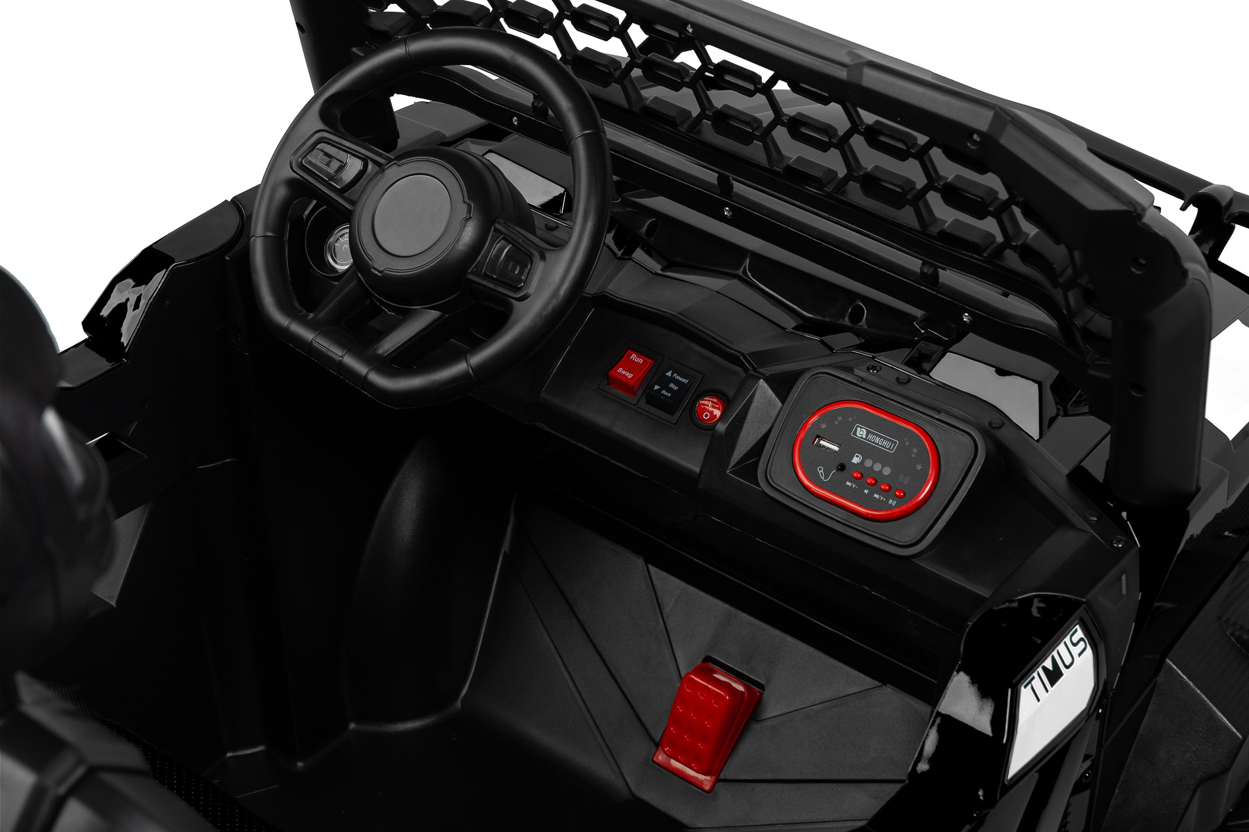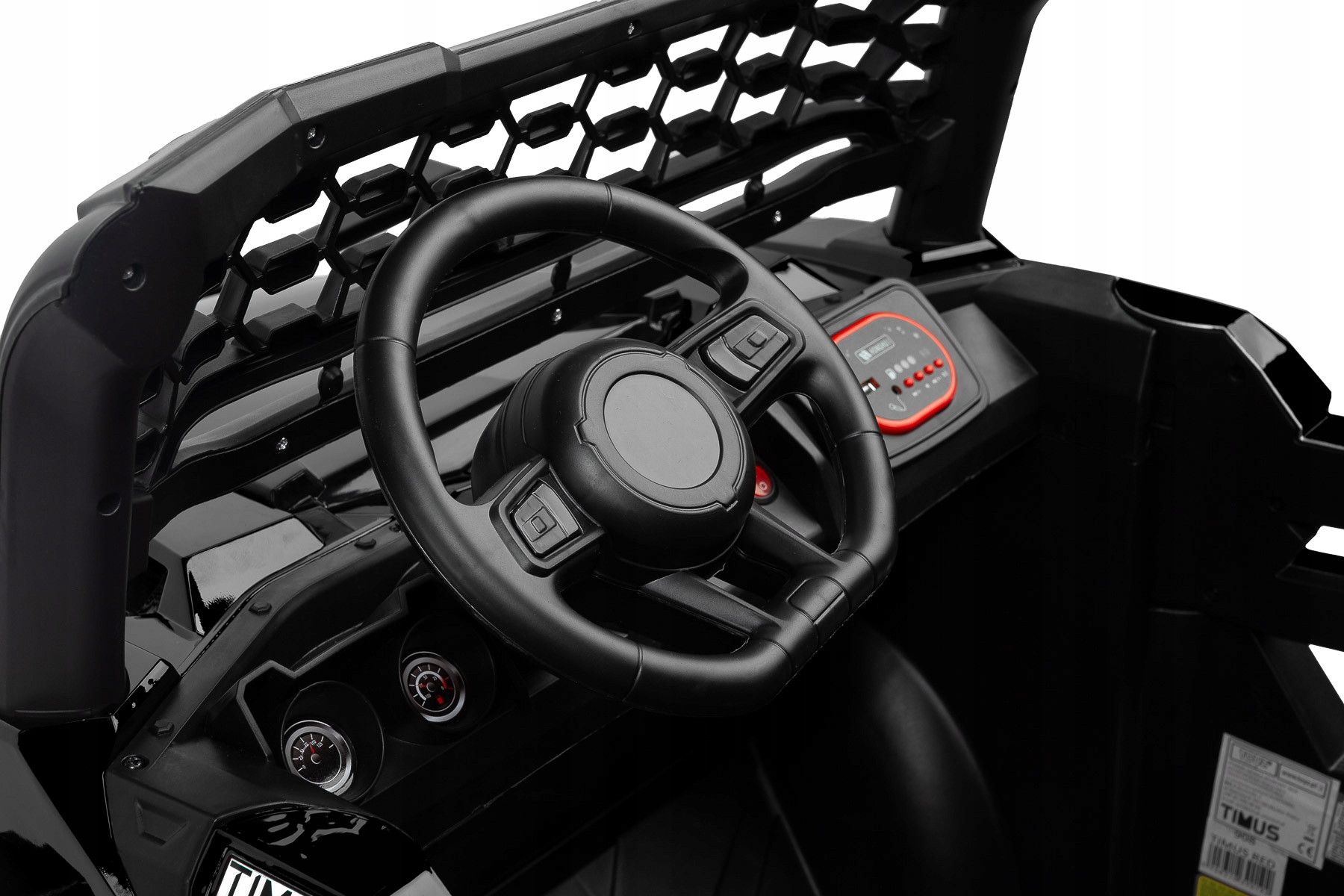 Удобство вождения обеспечит большое и удобное сиденье из эко-кожи, оснащенное поясным ремнем безопасности. Благодаря большому размеру Тимуса дети постарше смогут научиться ощущению пространства, а также ответственности и самостоятельности. Однако родители маленьких детей могут управлять транспортным средством дистанционно или воспользоваться функцией покачивания, которая заставляет транспортное средство слегка двигаться вперед и назад. Дополнительно время, проведенное в машине, сделает приятнее мультимедийная панель с USB и Bluetooth.