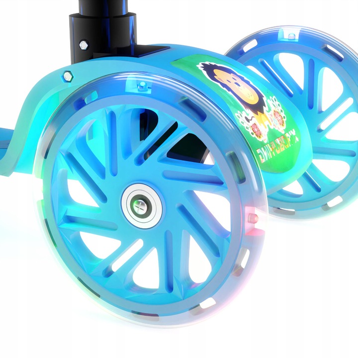 - Устройство оснащено специальным торсионным механизмом — для поворота необходимо соответствующим образом сбалансировать тело. Благодаря использованию трех колес самокат более устойчивый и более безопасный для ребенка. Он остается вертикальным сам по себе, опорные ножки не требуются.