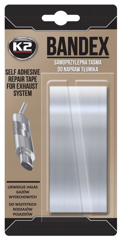K2 BANDEX — самоклеящаяся лента для ремонта глушителя. Устраняет шум выхлопных систем всех типов транспортных средств. Очень экономичен и устойчив к высоким температурам.