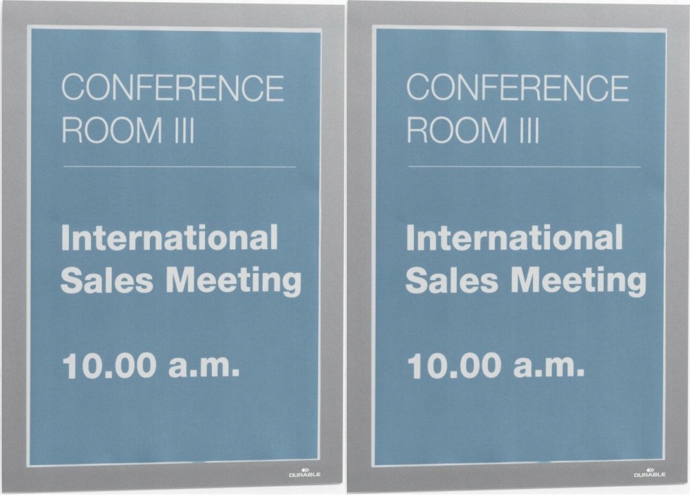 - При размещении на стеклянной поверхности информация видна с обеих сторон благодаря возможности размещения 2 вставок.