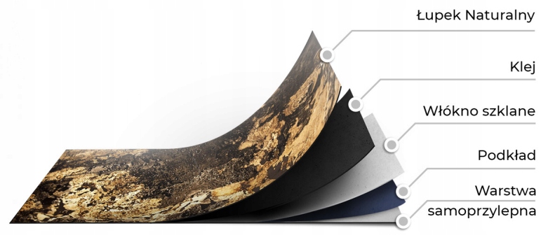 Основным сырьем, используемым для производства листов каменного шпона, является натуральный сланец. Это внешний слой облицовки, отрываемый непосредственно от лицевого слоя каменной плиты. Следующий слой – клей, который соединяет шифер со стекловолокном, которое, в свою очередь, крепится к основанию. Весь четырехслойный лист имеет толщину всего 2-3 мм, технически напоминающий обои более высокого класса и визуально толстую плиту из натурального камня.