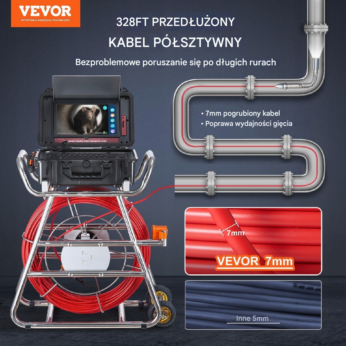 Инспекционная камера оснащена утолщенным полусвязанным шланговым кабелем диаметром 7 мм, изготовленным из прочного стекловолокна. Благодаря этому кабель чрезвычайно устойчив к повреждению, обеспечивая превосходную проходимость и долговечность, без затруднения преодоления углов и длинных труб. Идеально подходит для трудных условий, таких как темная и влажная среда, эффективно определение местоположения труб без риска растрескивания или разрыва