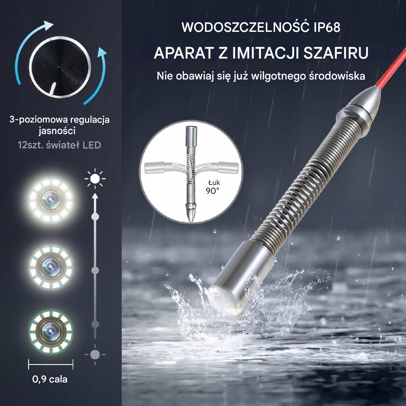 0,9 -INCH Camera автоматически поддерживает изображения в вертикальном положении благодаря функции самоуверенного. Оснащенный водонепроницаемым сапфировым объективом (IP68) и 12 регулируемыми светодиодными фонарями, адаптируется к различным условиям освещения, обеспечивая четкое изображение. 3-кратное цифровое зум и широкоугольный угол просмотра 145 ° позволяют запечатлеть каждую деталь, гарантируя комплексную проверку