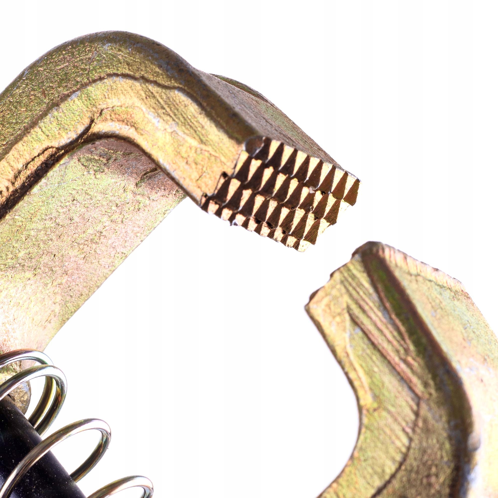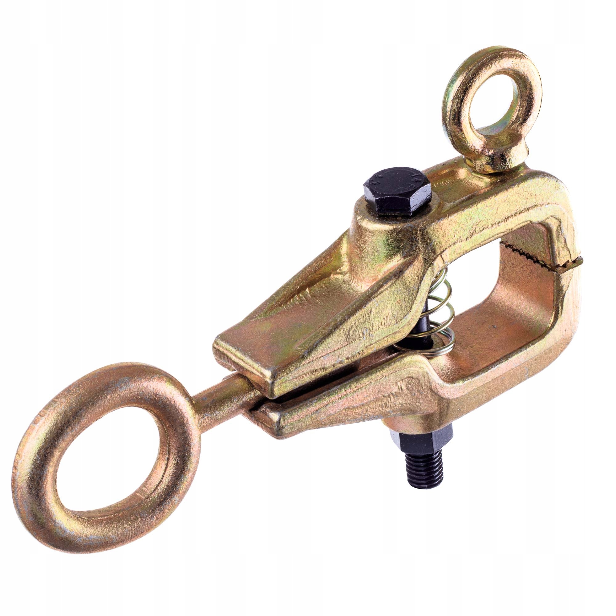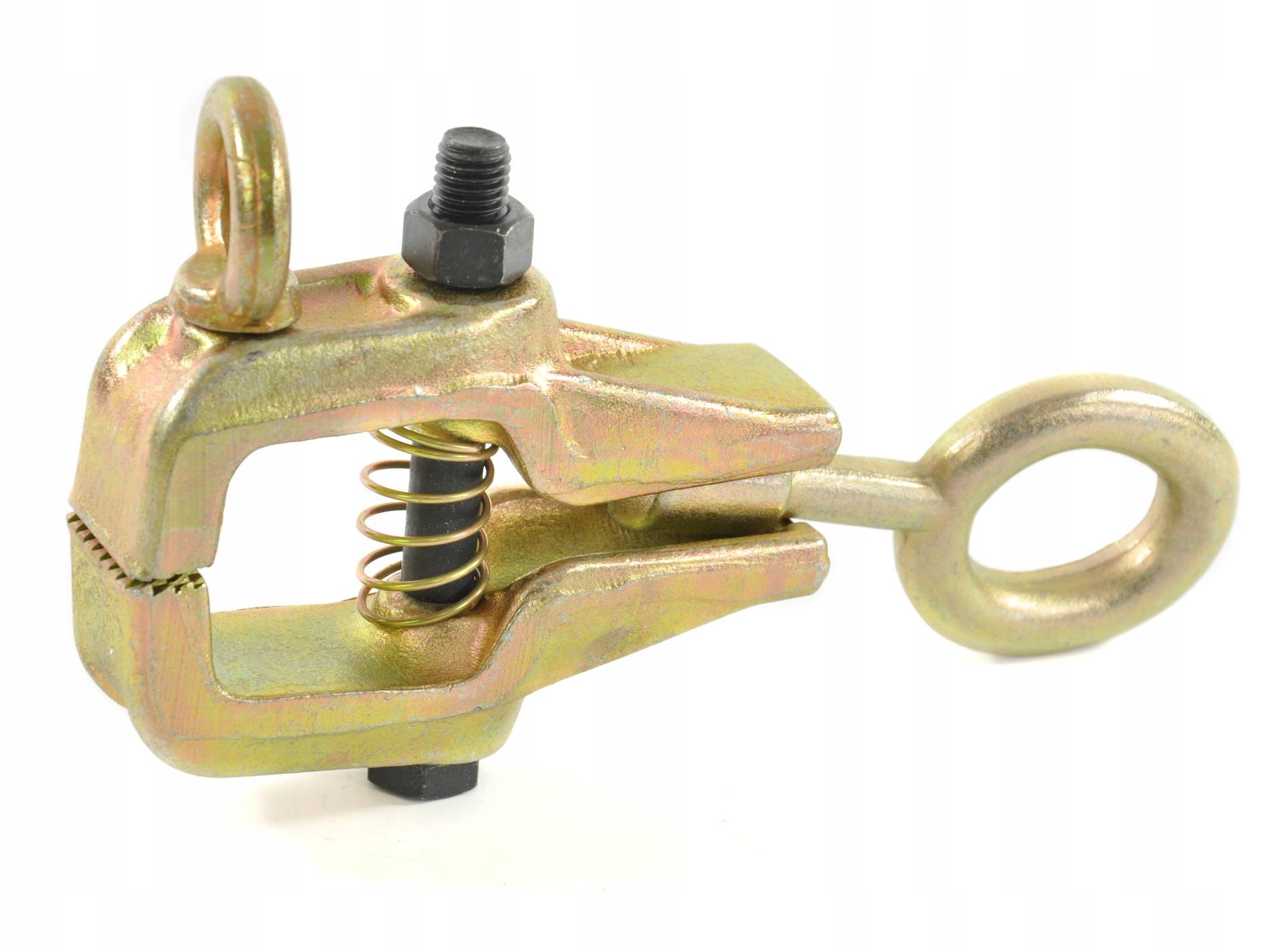 Зажим оснащен системой самозажима, которая увеличивает силу зажима губок за счет клина, помещенного в штифт проушины зажима. Губки имеют зубцы, которые увеличивают прочность захвата листового металла. Пряжка бывает одно- и двусторонняя. Подходит для растяжения автомобильного листового металла одновременно в двух направлениях.