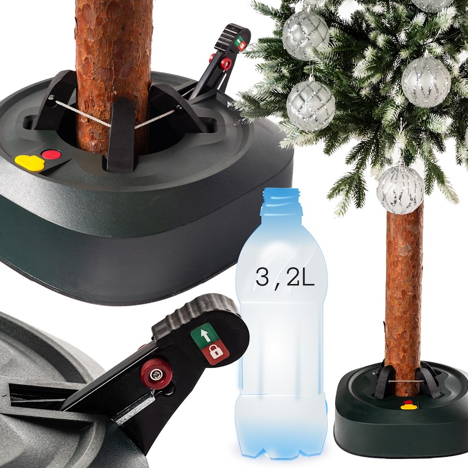 Просто вставьте ствол елки в подставку, нажмите на педаль – и механизм автоматически и прочно захватит елку, устанавливая ее ровно.