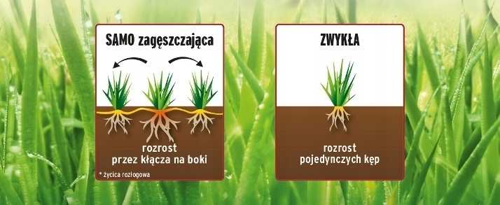 Быстрый и интенсивный рост травы позволяет газону постоянно омолаживаться, благодаря чему он выглядит свежим долгие годы, а не один сезон. Низкие междоузлия (на высоте 2-3 см) означают, что траву можно косить ниже, чем у большинства популярных видов, представленных на рынке. При повреждении комка (засуха, покос) свободное место на газоне заполнится новым комком травы из растущих вбок корневищ (самовосстановление). Он также более устойчив к морозам, поэтому лучше переживет зиму. Благодаря этим уникальным свойствам достигается длительный эффект – густой газон на долгие годы.