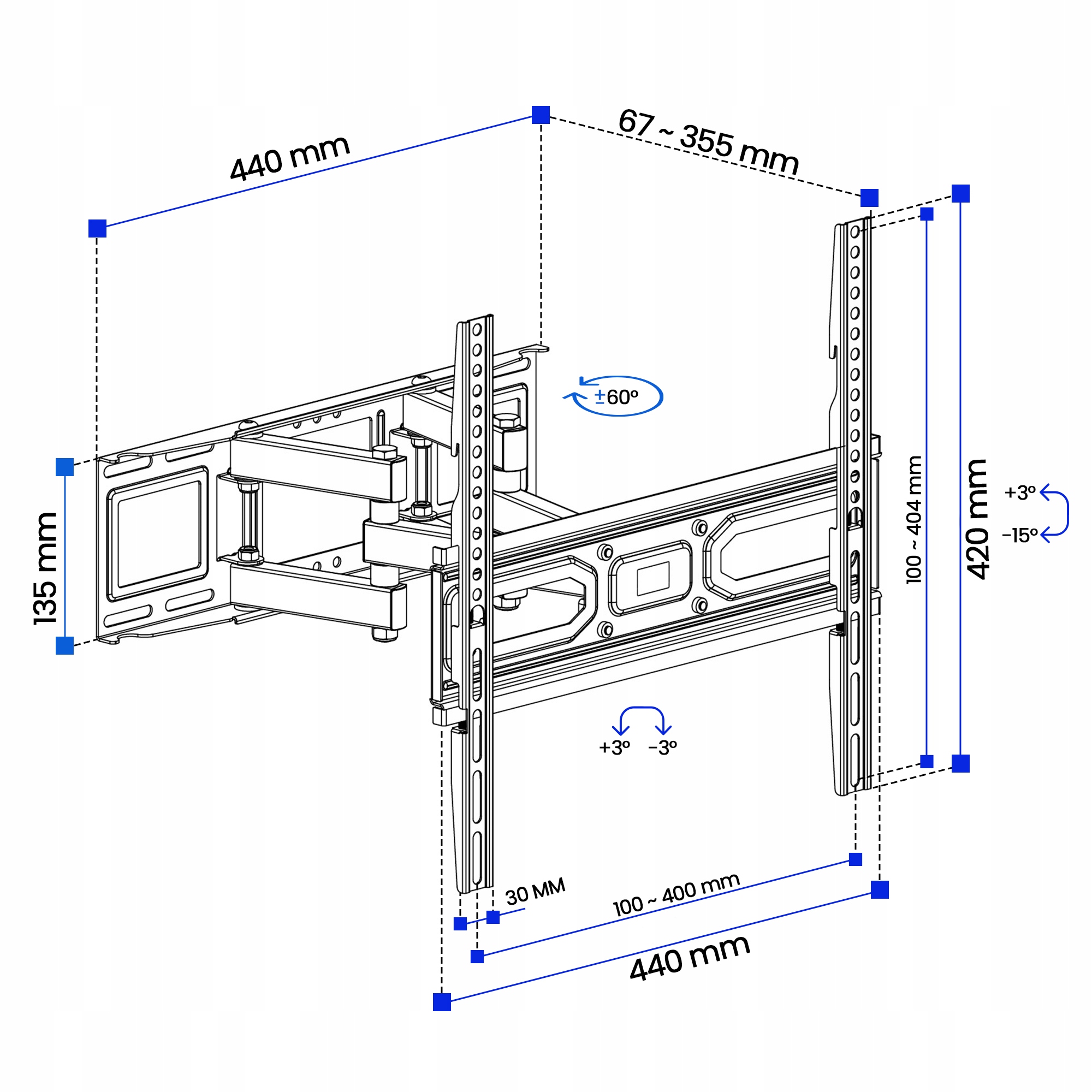 вешалка позволяет регулировать наклон - вверх и вниз от 3 ° до -15 ° . Благодаря этому вы можете легко настроить положение телевизора в удобное положение, независимо от того, расслабляетесь ли вы на диване или упражнениях перед телевизором.