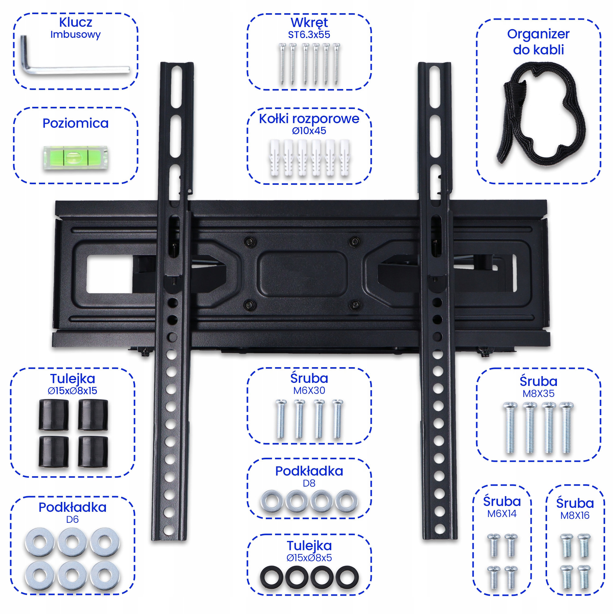 Монтажные аксессуары, включенные в набор, позволяют устанавливать не только ручку стен, но и телевизор ручки, не покупая дополнительные винты или винты. Благодаря этому вы уверены, что каждый элемент будет соответствовать вашему телевизору.