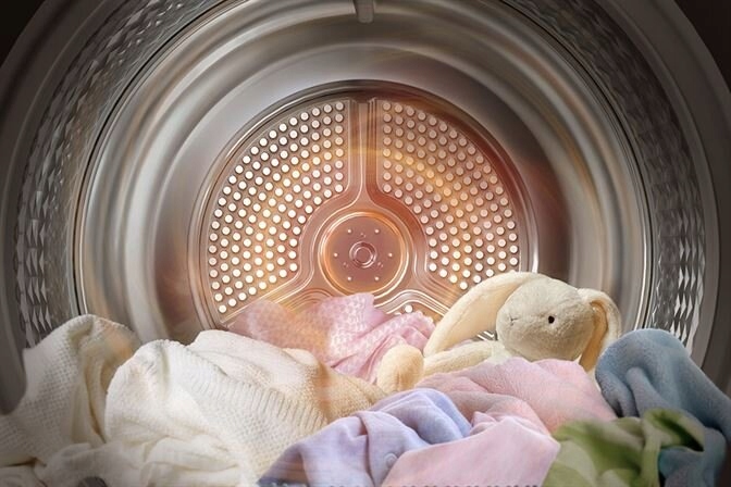 Благодаря гигиенической программе сушилка удаляет бактерии, клещи и аллергены из одежды, подушек или плюшевых игрушек. Дезинфекция с горячим воздухом включает в себя как сухой, так и влажный WAD14, что устраняет до 99% микробов, сохраняя при этом эффективность полной сушки