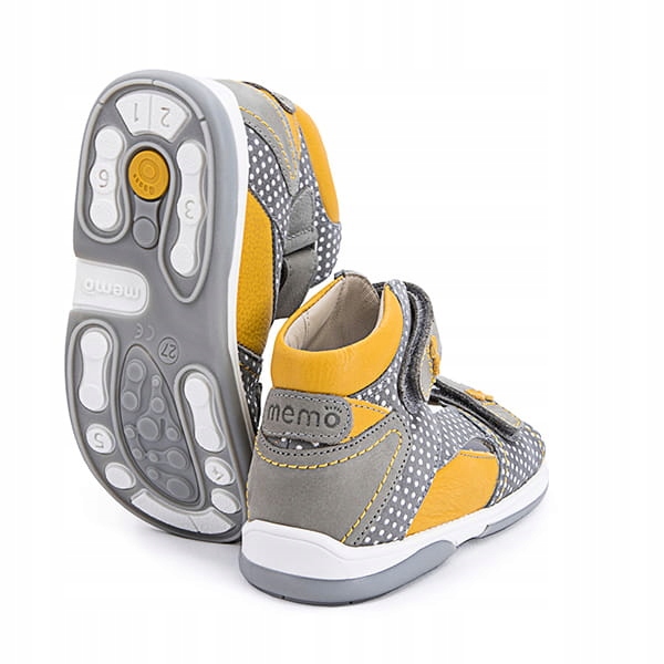 Серый - Желтая профилактическая сандалии Memo Monaco 1ma предназначена для девочек и доступна в размерах 22-31. Они сделаны из натуральной кожной кожи, которая особенно рекомендуется для детей. Обувь имеет диагностическую, корректирующую и профилактическую функцию для ног и коленей. Обувь также была адаптирована для ношения в детском саду, школе и дома. Вы можете положить ортопедические вставки в сандалии.