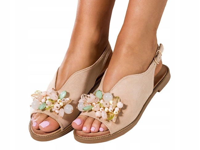 SANDAŁY DAMSKIE Z KORALIKI NA OZDOBNEJ PŁASKIEJ PODESZWIE BEŻOWE r 39