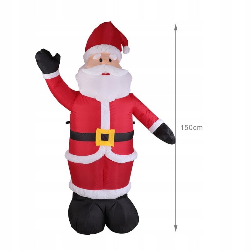 Санта-Клаус, который подходит как для внутреннего, так и для наружного применения, накачивается с помощью электрического насоса. По обеим сторонам Деда Мороза есть глаза, к которым можно прикрепить веревочки. Вместе с прикрепленной сумкой они обеспечивают устойчивое и вертикальное положение. При необходимости можно разместить дополнительные мешки с песком или грузы, расстегнув молнию на нижней части Санты.