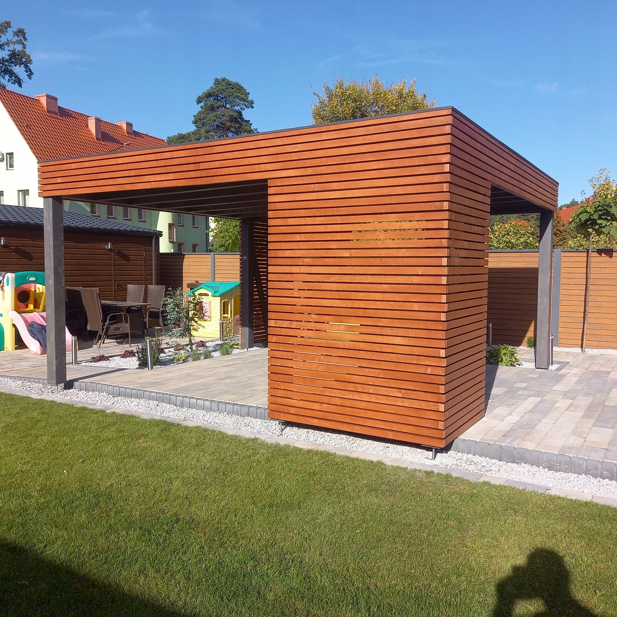 Гливице Сарай – это универсальное сооружение с современным характером, размеры которого составляют 4,5 х 5 м, позволяющее комфортно отдыхать многим людям. Этот навес изготовлен из массива дерева по технологии KVH, а кровельное покрытие из EPDM обеспечивает должную защиту от погодных условий на долгие годы. Угловые конструкции стен дополнены горизонтальными планками, что позволяет пользователям выбирать как затененные, так и открытые солнцу места, что делает конструкцию воздушной и придает беседке более современный дизайн.