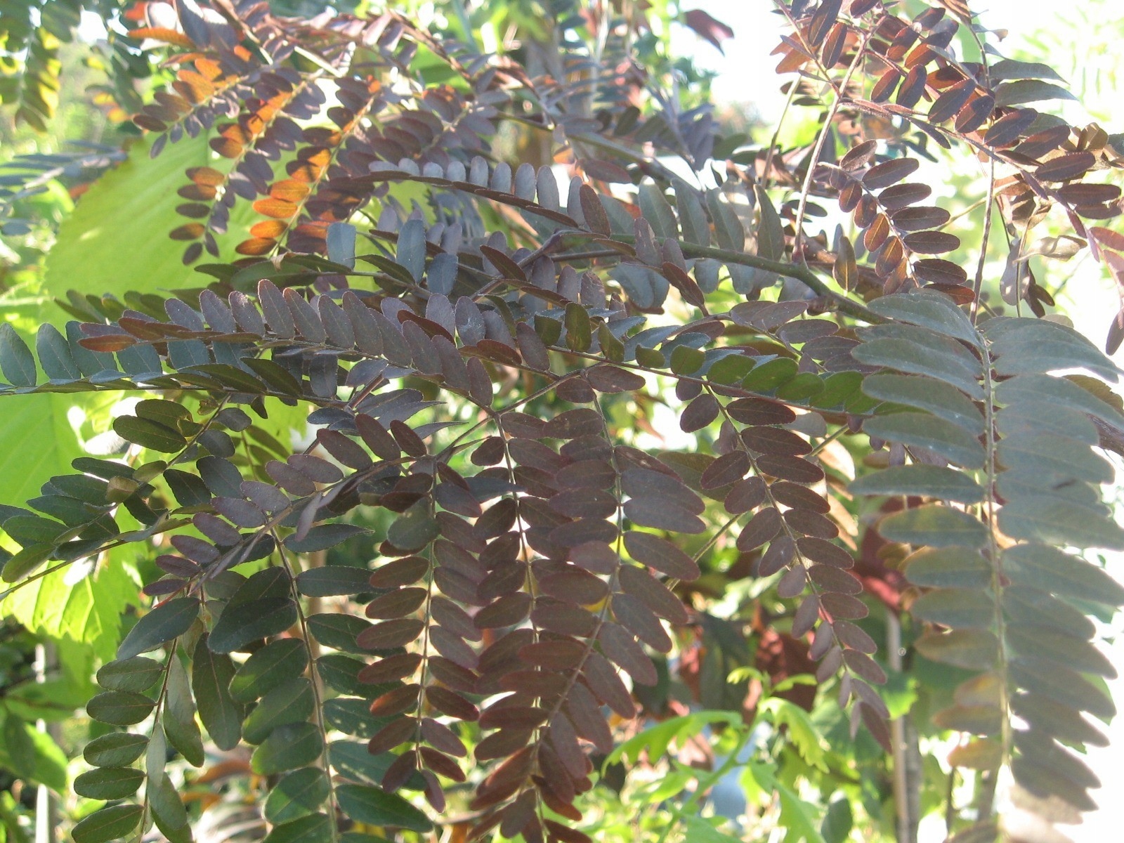 Разновидность гледиции, достигающая до 10 м высоты, прямостоячей, рыхлой формы. Побеги лишены характерных для вида шипов. Листья длинные, перисто-сложные, блестящие, очень привлекательной окраски: вначале красные, затем красно-коричневые, а при созревании — красно-зеленые.
