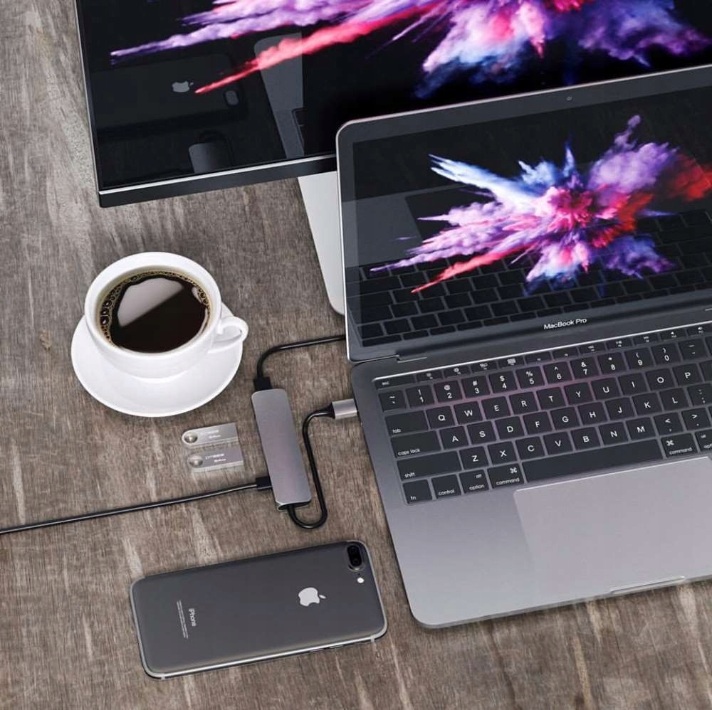 Тонкий профиль, компактный дизайн и элегантная алюминиевая отделка Многопортовый адаптер Slim сочетает в себе технологию, которая многократно расширит функциональность ноутбука или настольного компьютера. Все это с помощью одного порта USB-C, который при подключении к вашему устройству расширит его за счет дополнительных портов: