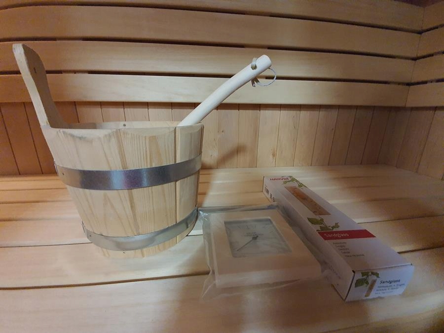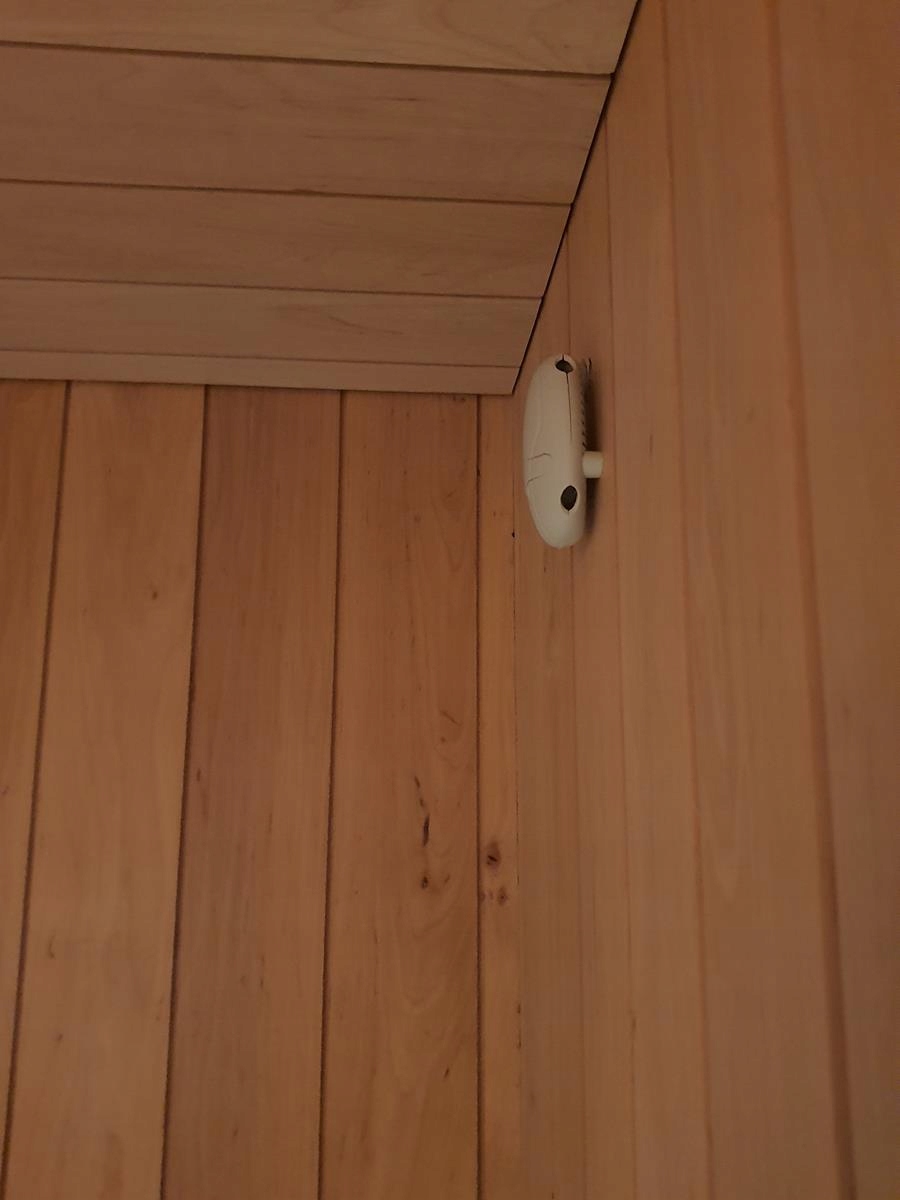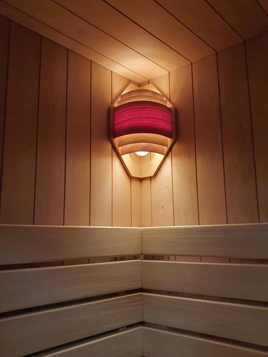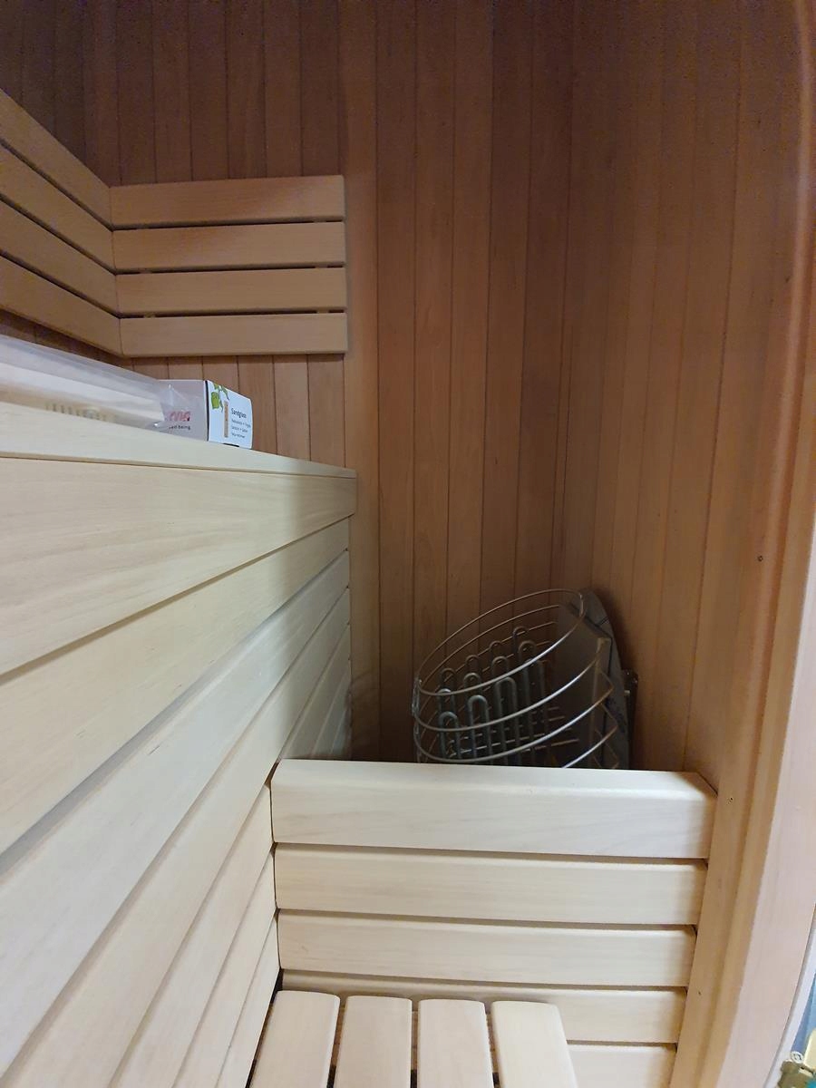 Сауна выполнена из вагонки из ольхи класса А толщиной 15 мм. Стены толщиной 65 мм, утеплены минеральной ватой 50 мм. Двери без порога, прозрачные. Скамейки, кожух печи, спинки, помост, подголовники из ненагревающегося дерева абачи.