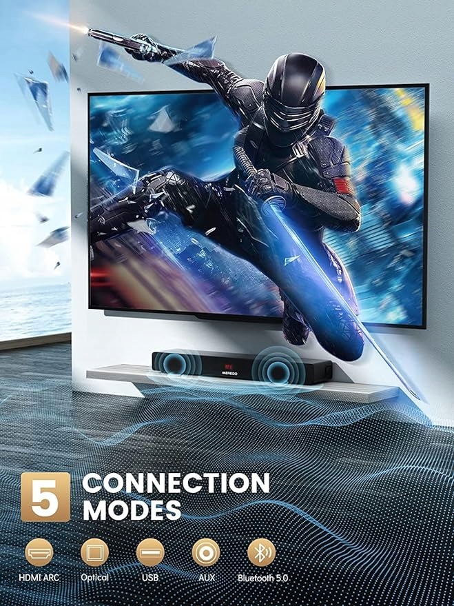 5 режимов подключения: обновление 5.0 Bluetooth, без задержек, только свобода, также поддерживает HDMI-ARC, оптический, AUX и USB. Через порт HDMI (ARC/CEC вы можете подключить к нему несколько совместимых устройств. звуковую панель, а благодаря передаче звука практически без потерь вы сможете наслаждаться ярким контентом.
