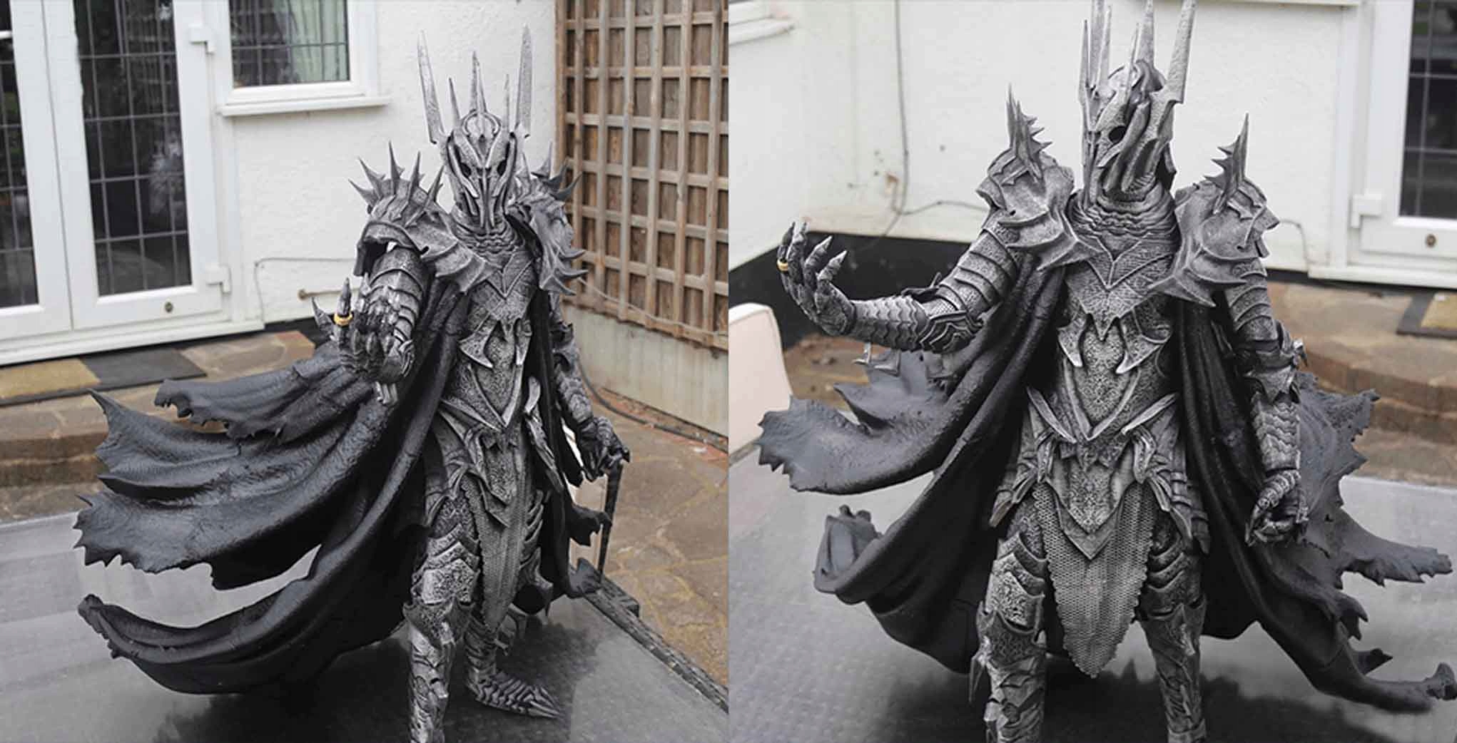 Благодаря стараниям художника фигурка Саурона может быть собрана как с огромной гофрированной накидкой, так и без нее. Не менее важными являются сменные руки фигурки Саурона, позволяющие воссоздать битву на склонах Роковой горы на различных ее этапах. Ваш Властелин Колец, напечатанный на 3D-принтере, может быть изображен как с могучей дубинкой с шестью лезвиями, так и с демонстрацией источника его силы — Единого Кольца. Груда черепов и фрагментов снаряжения под ногами могучего человека иллюстрирует его темную силу. Энтузиазм художника по поводу проекта подтверждается удивительными, искусно выполненными стальными гравюрами, обвивающими доспехи Саурона!