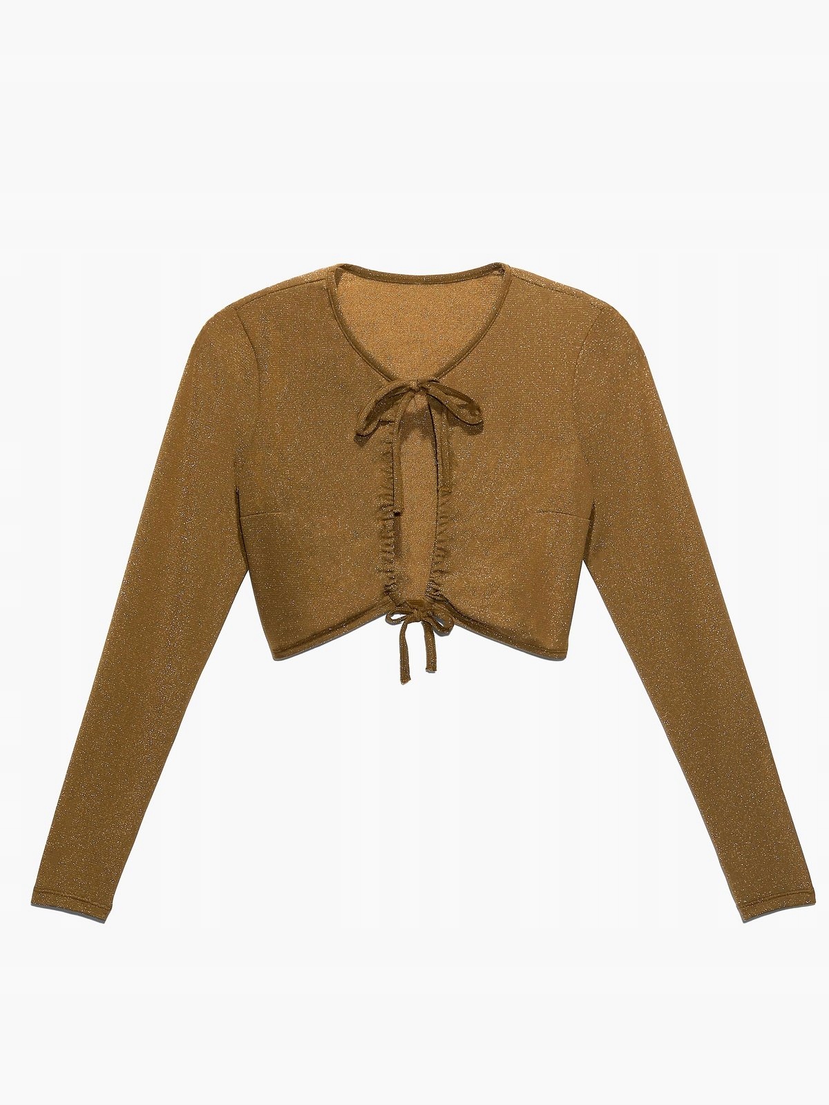Длинные рукава, вырез-капля спереди и функциональные завязки спереди.