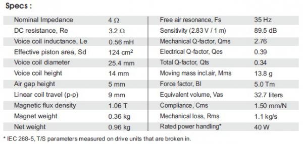 Корпус с фазоинвертором объемом 11,3 л, диаметром порта 38 мм и длиной 140 мм должен иметь нижнюю точку 3 дБ при частоте примерно 55 Гц.