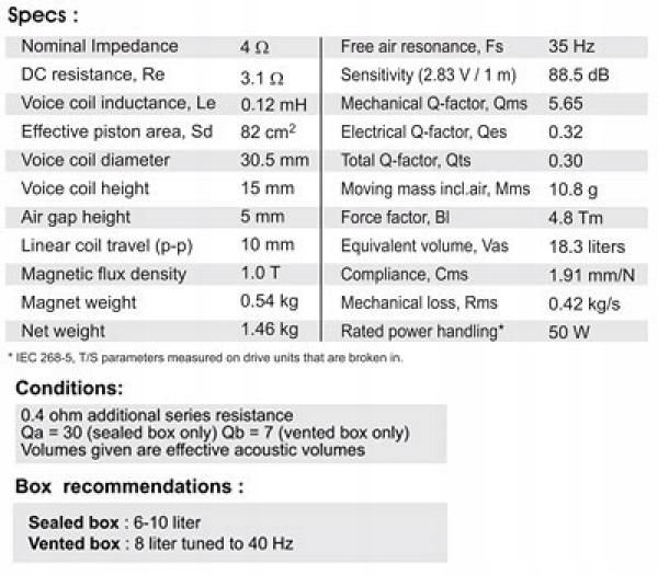 - Basreflex с трубой диаметром около 38 мм и длиной 127 мм, объем около 11 литров для F3 45 Гц