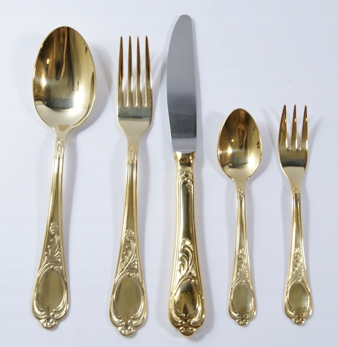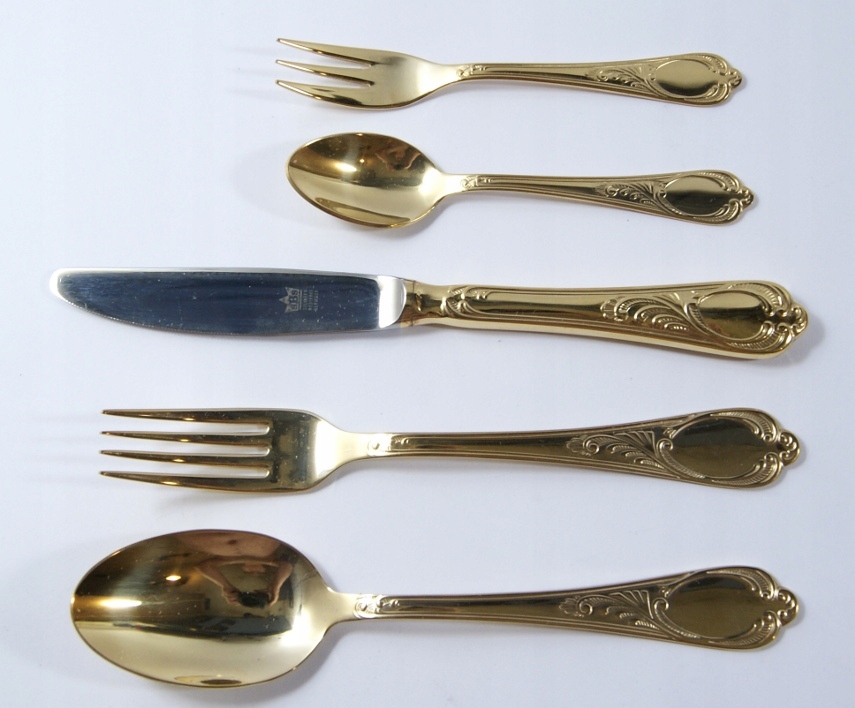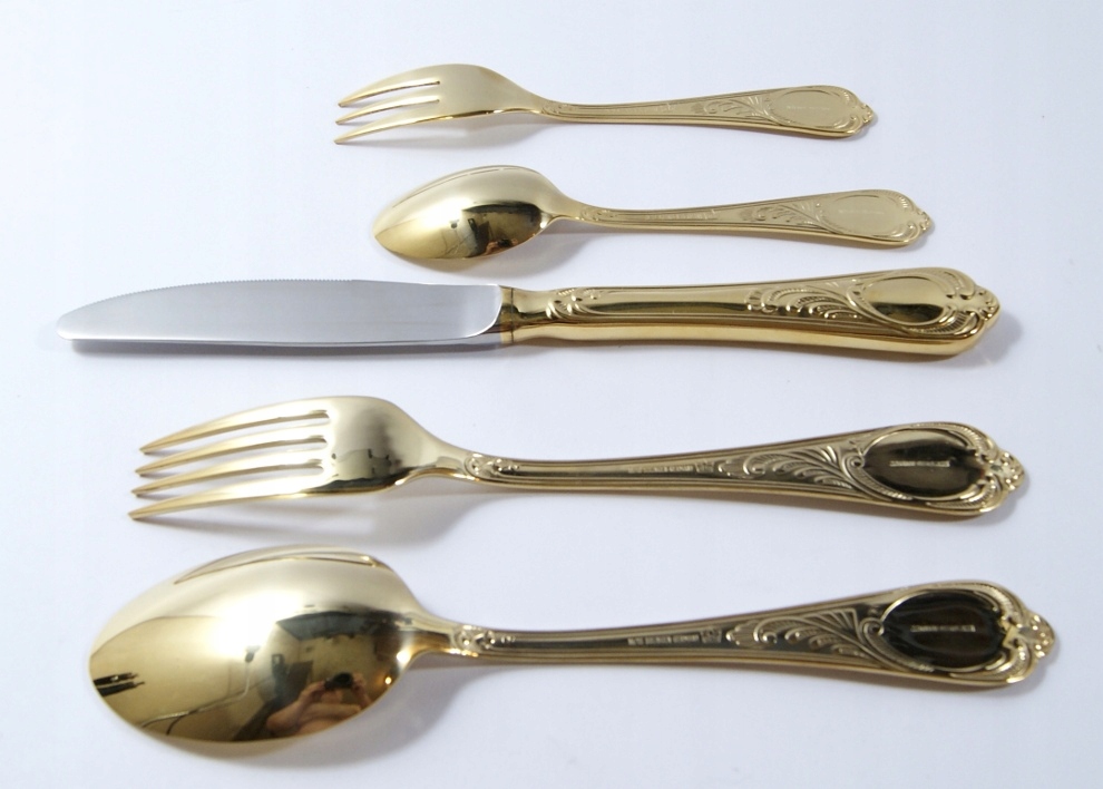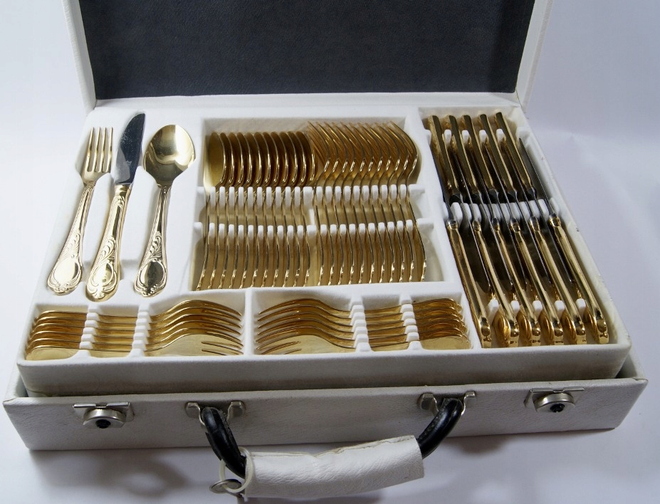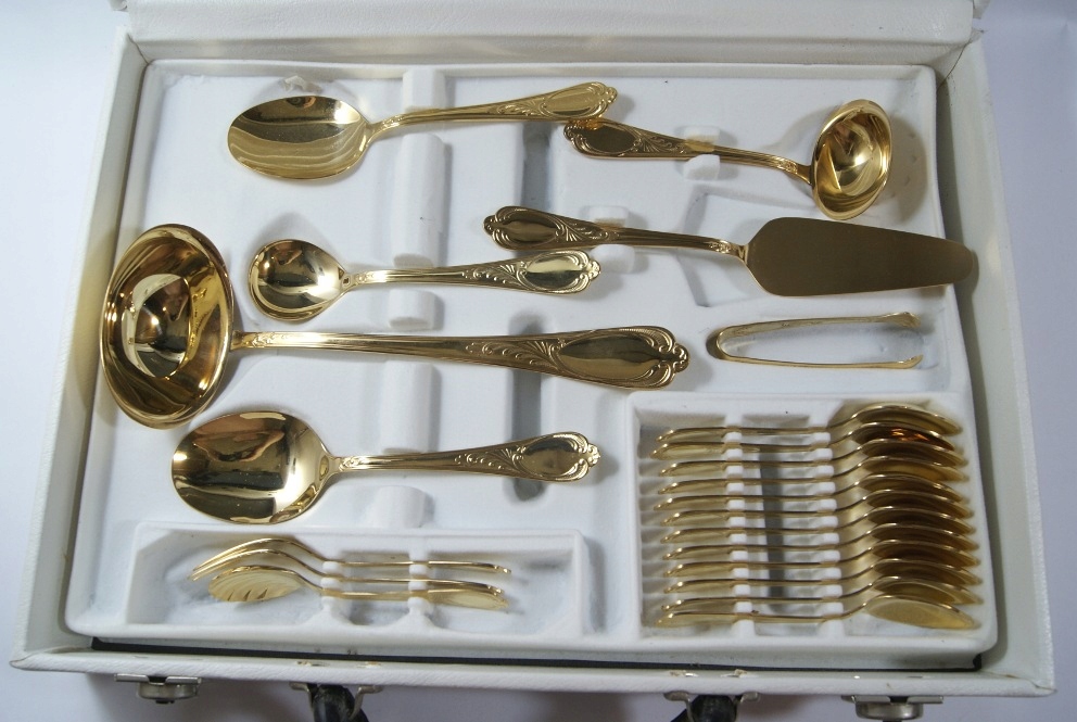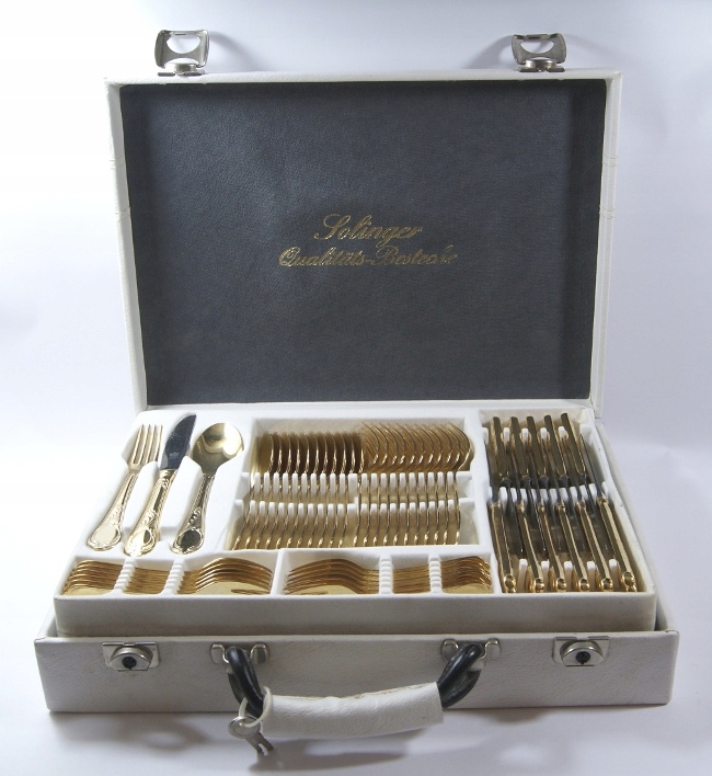 SBS ЗОЛИНГЕН – КРАСИВОЕ, ПОКРЫТОЕ СТАРЫМ ЗОЛОТОМ 23/24 карата. СТОЛОВЫЕ ПРИБОРЫ - 70 шт.