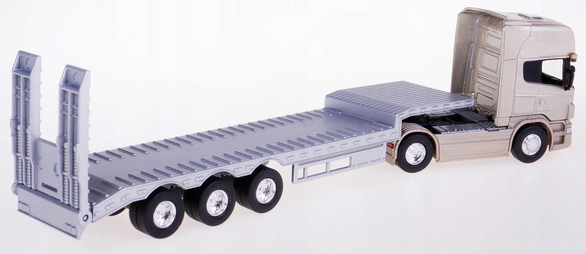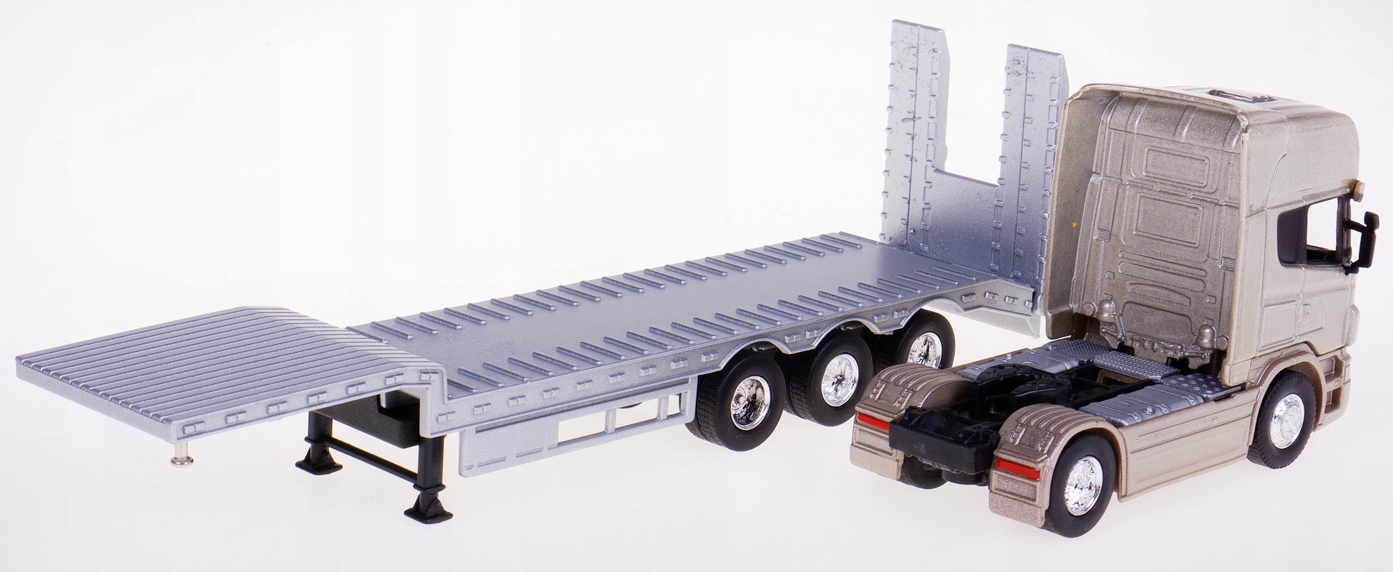 Модель тягача Scania изготовлена из металла с добавлением пластика и резиновых шин.