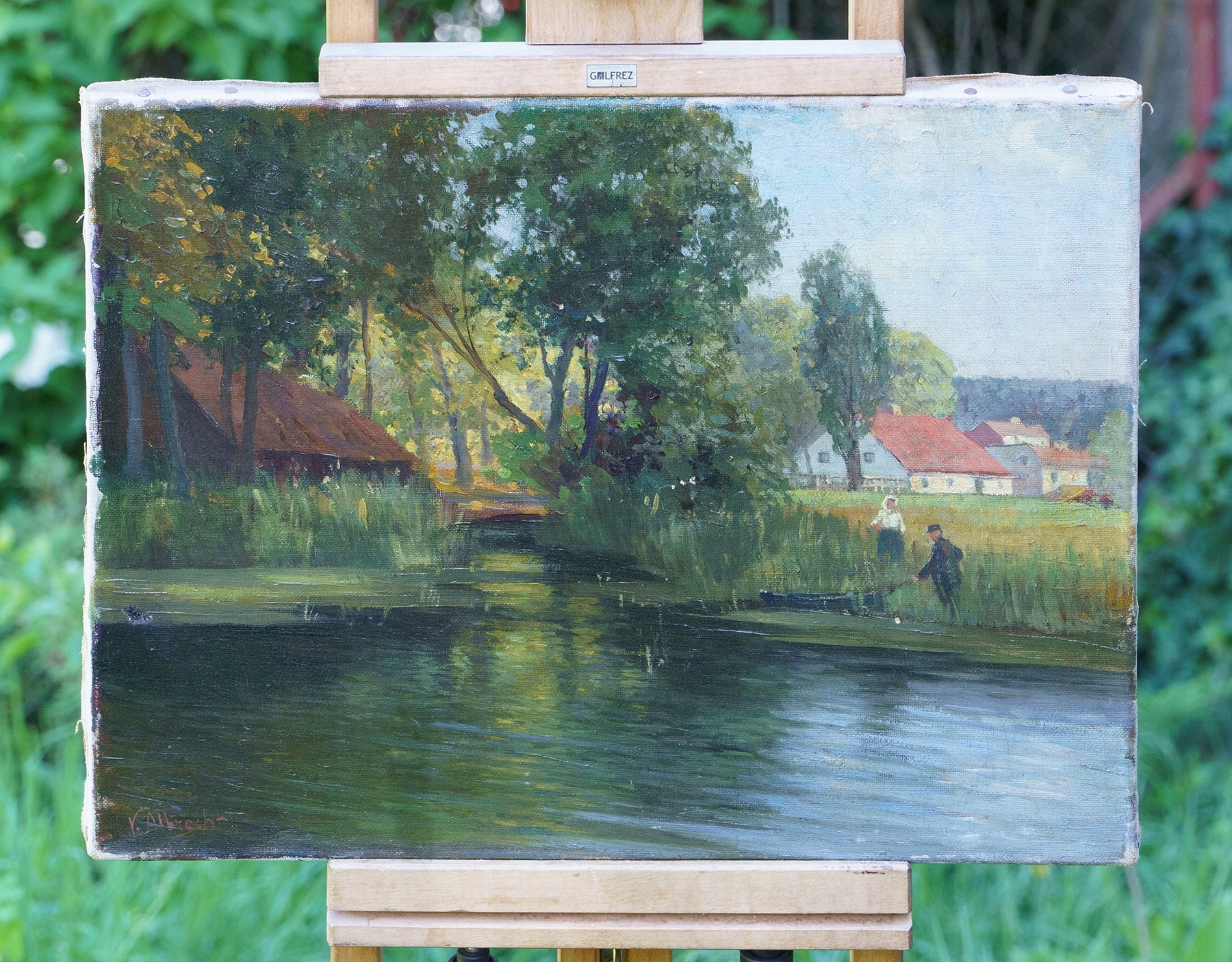 СЦЕНА У ВОДЫ СТАРАЯ КАРТИНА МАСЛОМ НА ХОЛСТЕ
