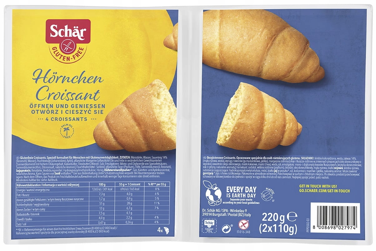 Просматривая «Schar Croissant Круассаны БЕЗ ГЛЮТЕНА 4х55г», вы можете быть уверены, что данный товар из каталога «[rubrica_name]» будет доставлен из Польши и проверен на целостность. В цене товара, указанной на сайте, учтена доставка из Польши. Внимание!!! Товары для Евросоюза, согласно законодательству стран Евросоюза, могут отличаться упаковкой или наполнением.