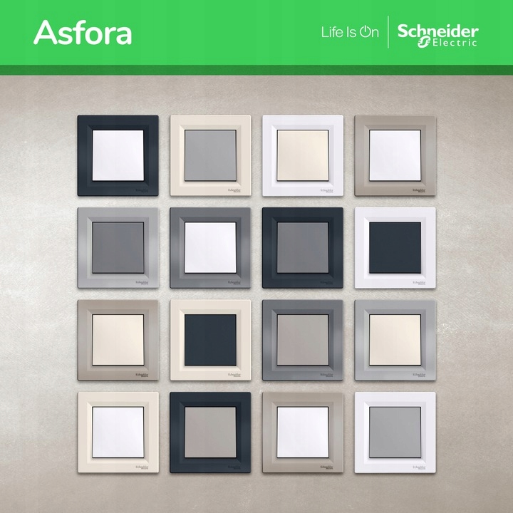 Продукция серии Асфора имеет широкий набор функций (однополюсные выключатели, подсвечники, розетки 2P+PE, розетки TV/SAT/SAT, розетки 2P+PE IP44 в двойном корпусе). рамка). Вы управляете жалюзи, благодаря подсветке легко находите выключатель света в темноте, а также создаете настроение в гостиной или спальне с помощью диммеров. У вас есть доступ к средствам массовой информации (розетки TVRSAT, розетки RJ45) и вы наслаждаетесь отличным качеством звука (розетки для динамиков, кабели, эстетически спрятанные в стене). Электромонтажное оборудование Asfora с таким широким набором функций делает жизнь проще и приятнее. Asfora Schneider Electric — классика по хорошей цене!