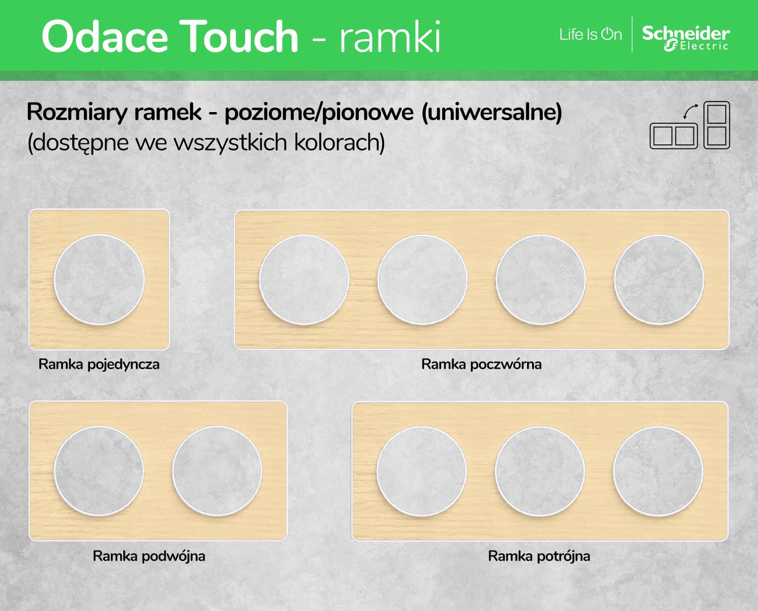 - Odace TouchДоступный широкий выбор антрацитовой и алюминиевой отделки разъемов и розеток обеспечивает элегантный внешний вид. и успокаивающий сенсорный опыт. Ассортимент электромонтажных аксессуаров Odace Touch обращается к природе, окружающей человека. К материалам, из которых изготовлена продукция, относятся: дерево, металл и камень.