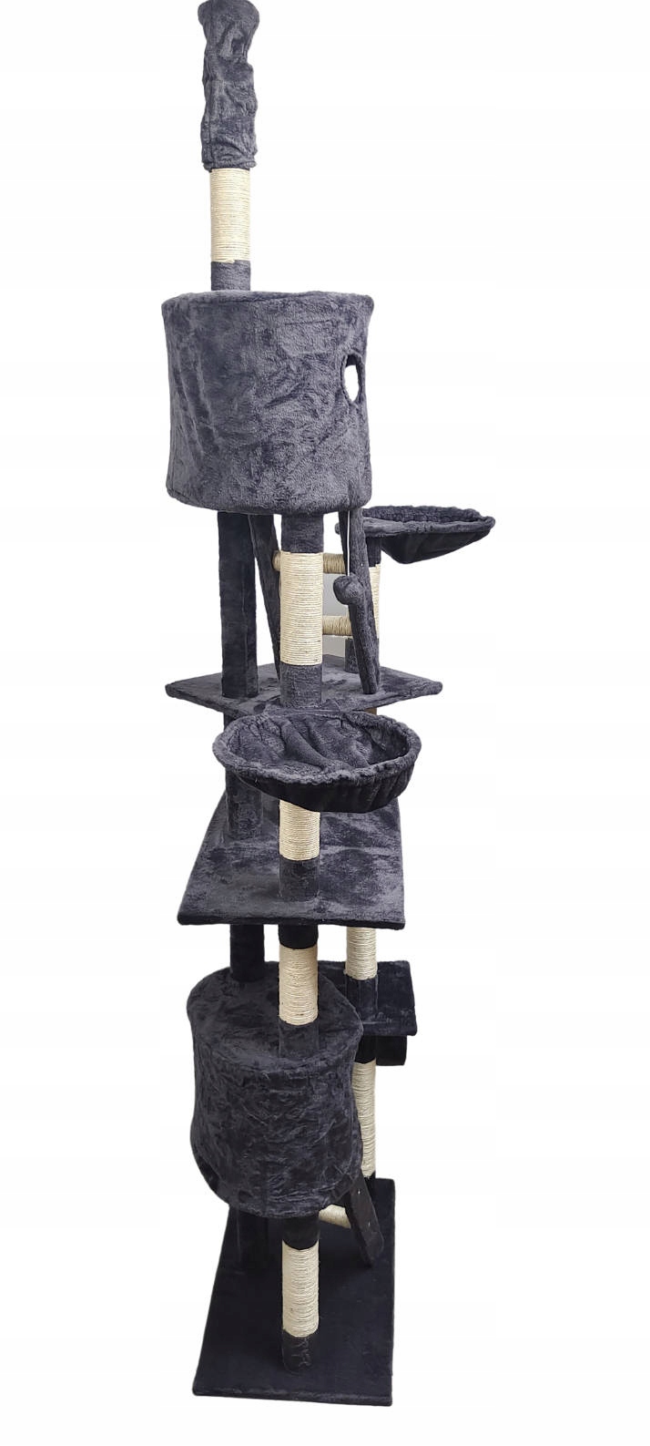Высококачественная многофункциональная модель когтеточки предлагает различные формы активности и отдыха для вашей кошки. Он может удовлетворить потребности даже самых требовательных домашних животных. 10-уровневая когтеточка с потолочным креплением – прекрасное решение для любой квартиры и интересный декоративный элемент. Кошачья площадка оборудована когтеточками, туннелем, 3 смотровыми площадками, двумя гамаками и двумя лестницами, ведущими в кабинки, облицованные приятным на ощупь плюшевым материалом. Это идеальное место, чтобы спрятаться или расслабиться. Дополнительно в комплекте идут 2 резиновых мячика, идеальных для игры и удовлетворения инстинкта охотника. Наши когтеточки изготовлены из безопасного материала: мебельного щита, искусственного плюша, столбиков, обмотанных толстой веревкой из сизаля. Большое основание обеспечивает стабильность и безопасность. Прочная конструкция с расширительным основанием для потолка. Легко собирается, оснащен инструкцией и набором аксессуаров.