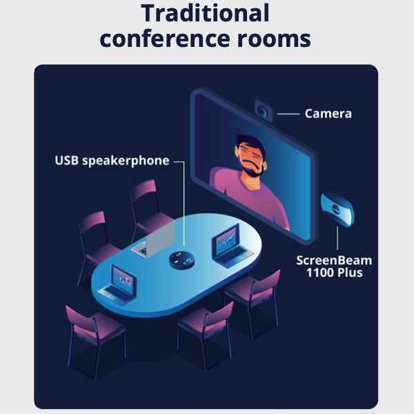 Кроме того, ScreenBeam 1100 Plus предлагает входной порт HDMI, благодаря которому также можно передавать изображение по проводу без необходимости изменения конфигурации в конференц-зале.