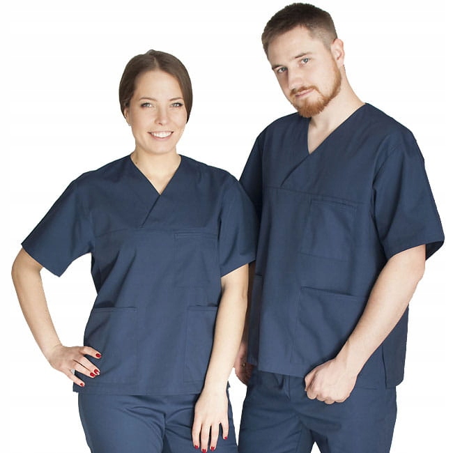 Классическая мужская и женская медицинская толстовка с V-образным вырезом и короткими рукавами темно-синего цвета. Наденьте через голову. Изготовлен из прочной ткани, обеспечивающей долгий срок службы.